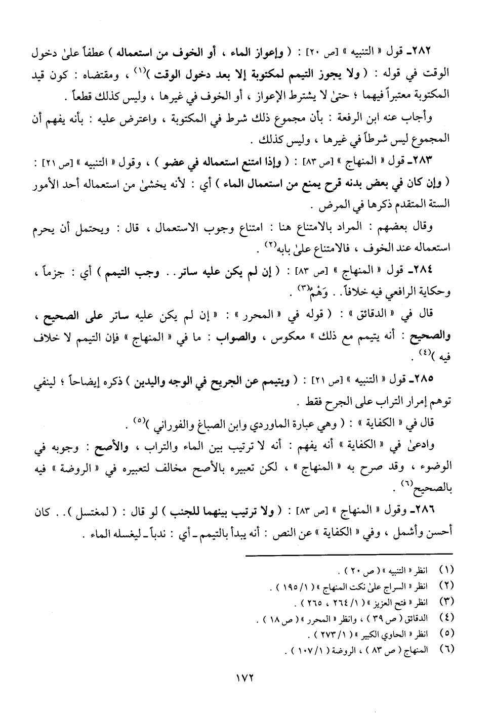 283 - قول "المنهاج" [ص 83]: (وإذا امتنع استعماله في عضو)، وقول "التنبيه" [ص 21]: (وإن كان في بعض بدنه قرح يمنع من استعمال الماء) أي؛ لأنه يخشى من استعماله أحد الأمور الستة المتقدم ذكرها في المرض.