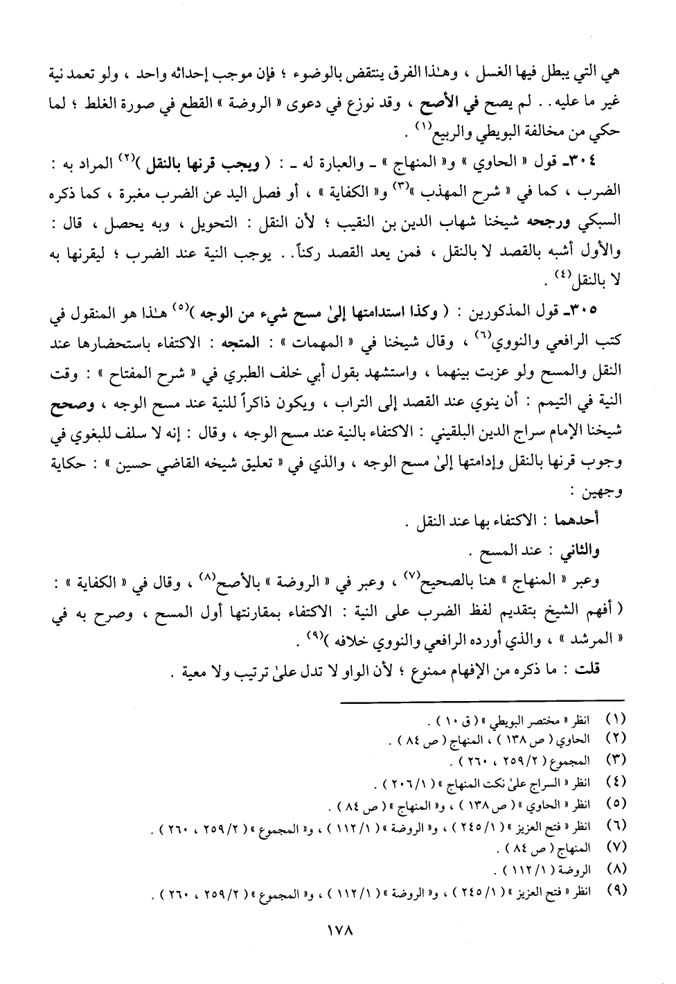 305 - قول المذكورين: (وكذا استدامتها إلى مسح شيء من الوجه) (¬5) هذا هو المنقول في كتب الرافعي والنووي (¬6)، وقال شيخنا في "المهمات": المتجه: الاكتفاء باستحضارها عند النقل والمسح ولو عزبت بينهما، واستشهد يقول أبي خلف الطبري في "شرح المفتاح": وقت النية في التيمم: أن ينوي عند القصد إلى التراب، ويكون ذاكرًا للنية عند مسح الوجه، وصحح شيخنا الإِمام سراج الدين البلقيني: الاكتفاء بالنية عند مسح الوجه، وقال: إنه لا سلف للبغوي في وجوب قرنها بالنقل وإدامتها إلى مسح الوجه، والذي في "تعليق شيخه القاضي حسين": حكايته وجهين: