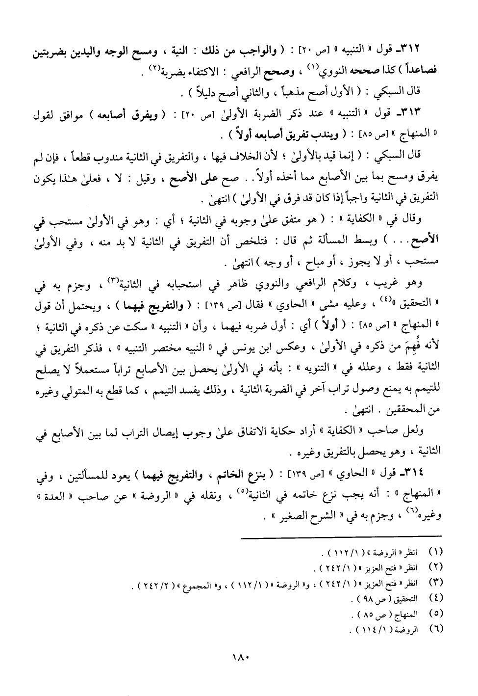 313 - قول "التنبيه" عند ذكر الضربة الأولى [ص 20]: (ويفرق أصابعه) موافق لقول "المنهاج" [ص 85]: (ويندب تفريق أصابعه أولًا).