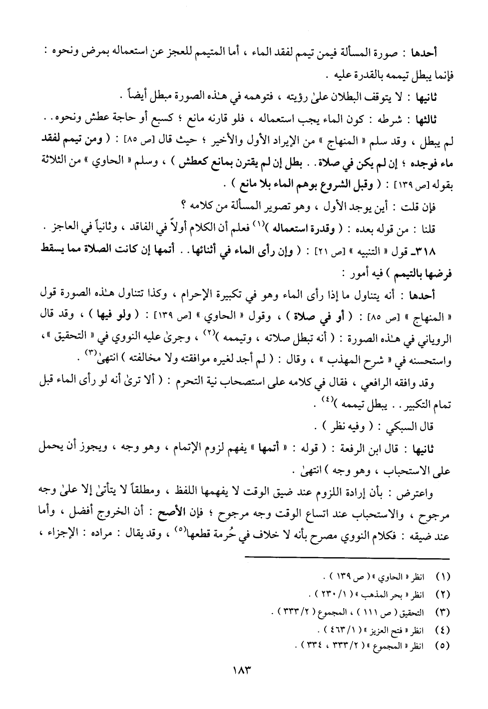 318 - قول "التنبيه" [ص 21]: (وإن رأى الماء في أثنائها .. أتمها إن كانت الصلاة مما يسقط فرضها بالتيمم) فيه أمور: