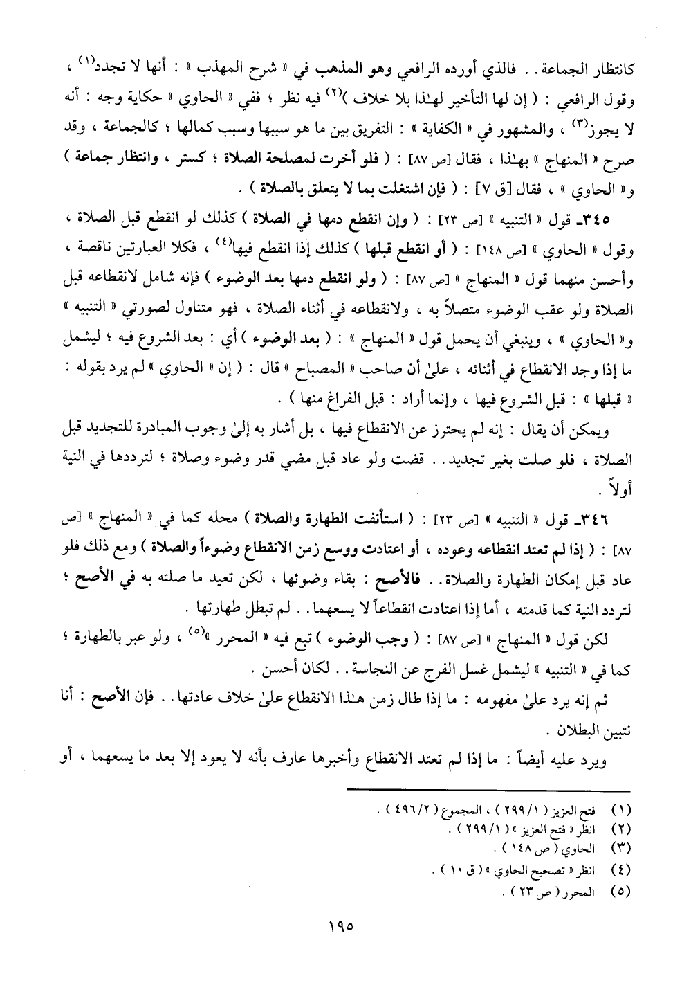 346 - قول "التنبيه" [ص 23]: (استأنفت الطهارة والصلاة) محله كما في "المنهاج" [ص 87]: (إذا لم تعتد انقطاعه وعوده، أو اعتادت ووسع زمن الانقطاع وضوءًا والصلاة) ومع ذلك فلو عاد قبل إمكان الطهارة والصلاة .. فالأصح: بقاء وضوئها, لكن تعيد ما صلته به في الأصح؛ لتردد النية كما قدمته، أما إذا اعتادت انقطاعًا لا يسعهما .. لم تبطل طهارتها.