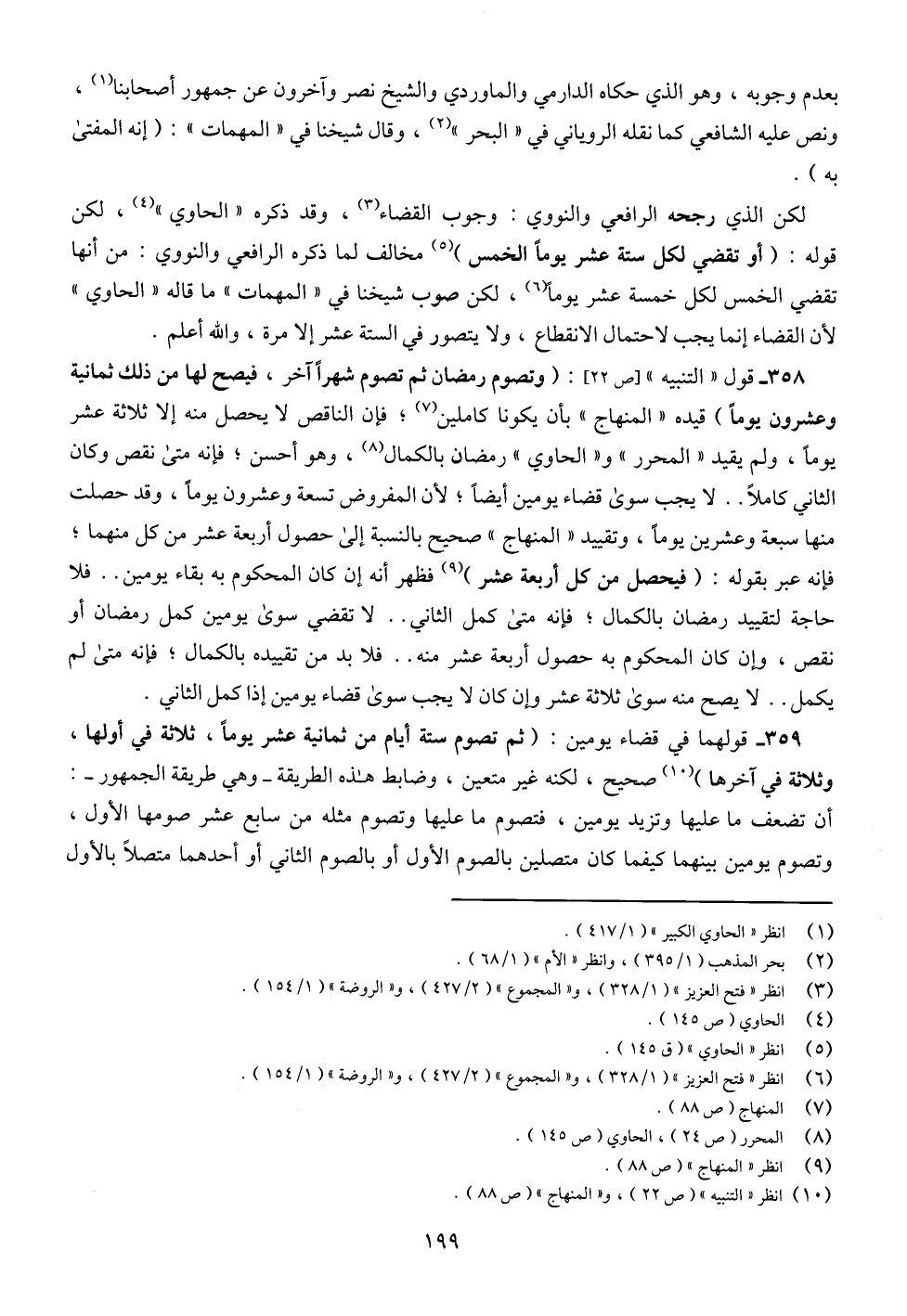 358 - قول "التنبيه" [ص 22]: (وتصوم رمضان ثم تصوم شهرًا آخر، فيصح لها من ذلك ثمانية وعشرون يومًا) قيده "المنهاج" بأن يكونا كاملين (¬7)، فإن الناقص لا يحصل منه إلا ثلاثة عشر يومًا، ولم يقيد "المحرر" و "الحاوي" رمضان بالكمال (¬8)، وهو أحسن؛ فإنه متى نقص وكان الثاني كاملًا .. لا يجب سوى قضاء يومين أيضًا؛ لأن المفروض تسعة وعشرون يومًا، وقد حصلت منها سبعة وعشرين يومًا، وتقييد "المنهاج" صحيح بالنسبة إلى حصول أربعة عشر من كل منهما، فإنه عبر بقوله: (فيحصل من كل أربعة عشر) (¬9) فظهر أنه إن كان المحكوم به بقاء يومين .. فلا حاجة لتقييد رمضان بالكمال؛ فإنه متى كمل الثاني .. لا تقضي سوى يومين كمل رمضان أو نقص، وإن كان المحكوم به حصول أربعة عشر منه .. فلا بد من تقييده بالكمال؛ فإنه متى لم يكمل .. لا يصح منه سوى ثلاثة عشر وإن كان لا يجب سوى قضاء يومين إذا كمل الثاني.