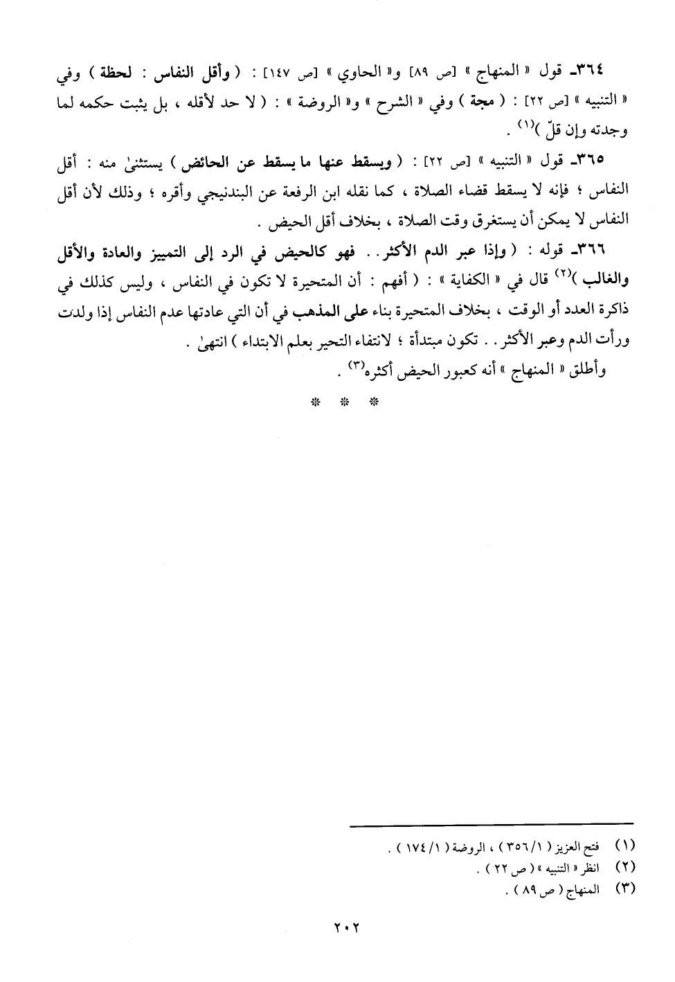 364 - قول "المنهاج" [ص 89] و"الحاوي" [ص 147]: (وأقل النفاس: لحظة) وفي "التنبيه" [ص 22]: (مجة) وفي "الشرح" و" الروضة ": (لا حد لأقله، بل يثبت حكمه لما وجدته وإن قلّ) (¬1).
