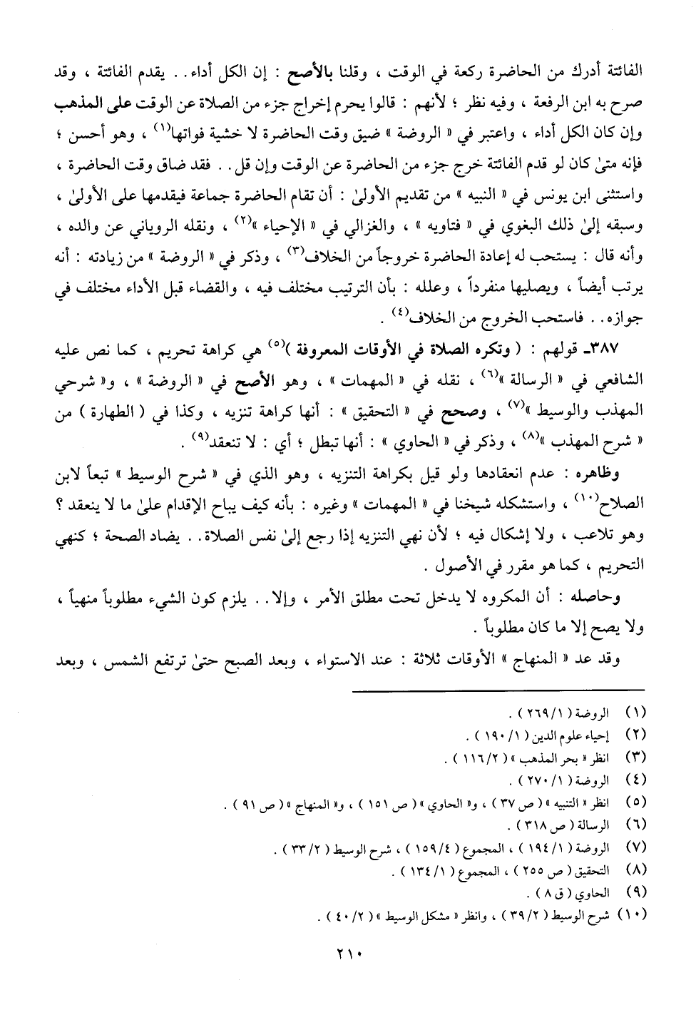 387 - قولهم: (وتكره الصلاة في الأوقات المعروفة) (¬5) هي كراهة تحريم، كما نص عليه الشافعي في " الرسالة " (¬6)، نقله في " المهمات "، وهو الأصح في " الروضة "، و" شرحي المهذب والوسيط " (¬7)، وصحح في " التحقيق ": أنها كراهة تنزيه، وكذا في (الطهارة) من " شرح المهذب " (¬8)، وذكر في " الحاوي ": أنها تبطل؛ أي: لا تنعقد (¬9).