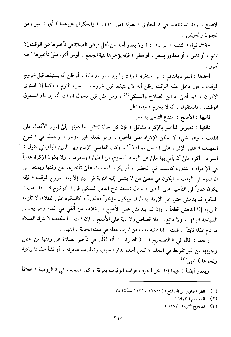 398 - قول " التنبيه " [ص 24]: (ولا يعذر أحد من أهل فرض الصلاة في تأخيرها عن الوقت إلا نائم، أو ناس، أو معذور بسفر، أو مطر؛ فإنه يؤخرها بنية الجمع، أومن أكره على تأخيرها) فيه أمور: