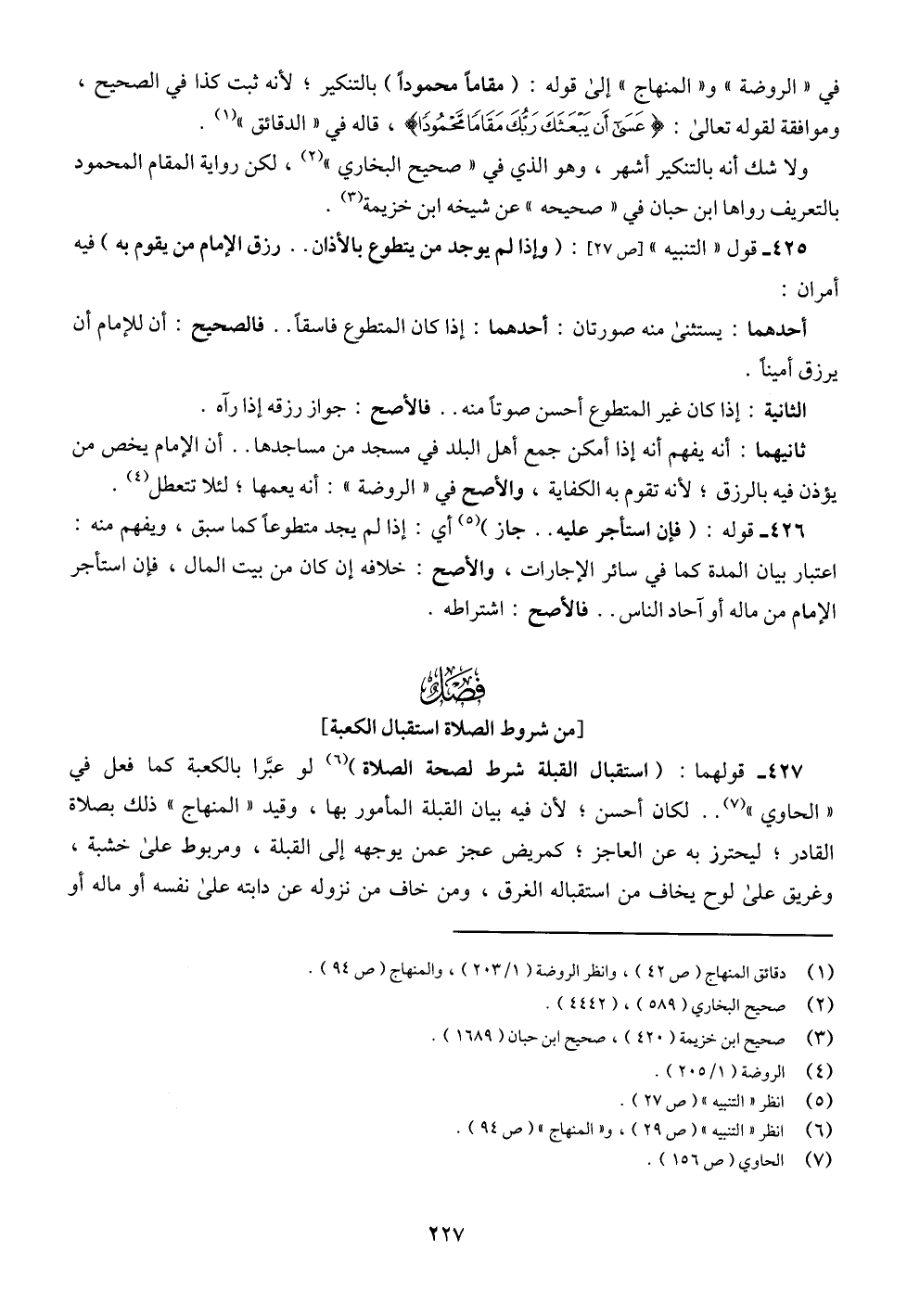 425 - قول " التنبيه " [ص 27]: (وإذا لم يوجد من يتطوع بالأذان .. رزق الإمام من يقوم به) فيه أمران: