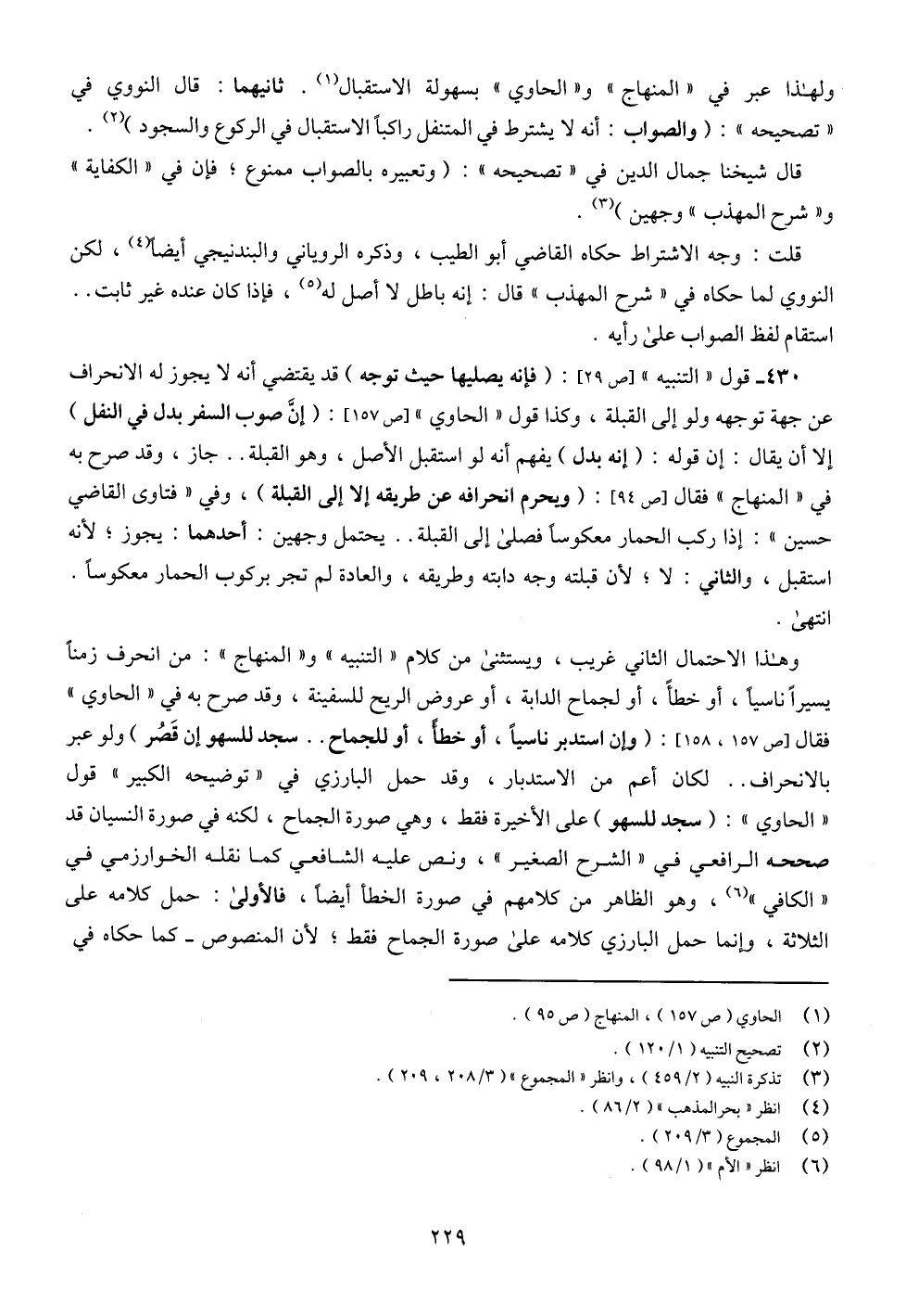 430 - قول " التنبيه " [ص 29]: (فإنه يصليها حيث توجه) قد يقتضي أنه لا يجوز له الانحراف عن جهة توجهه ولو إلى القبلة، وكذا قول " الحاوي " [ص 157]: (إنَّ صوب السفر بدل في النفل) إلا أن يقال: إن قوله: (إنه بدل) يفهم أنه لو استقبل الأصل، وهو القبلة .. جاز، وقد صرح به في " المنهاج " فقال [ص 94]: (ويحرم انحرافه عن طريقه إلا إلى القبلة)، وفي " فتاوى القاضي حسين ": إذا ركب الحمار معكوسًا فصلى إلى القبلة .. يحتمل وجهين: أحدهما: يجوز؛ لأنه استقبل، والثاني: لا؛ لأن قبلته وجه دابته وطريقه، والعادة لم تجر بركوب الحمار معكوساً. انتهى.