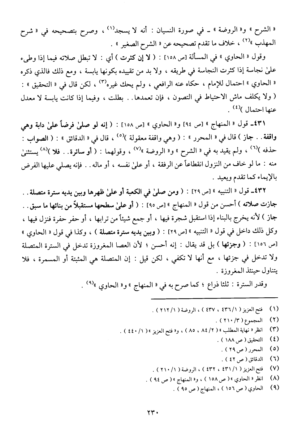 431 - قول " المنهاج " [ص 94] و" الحاوي " [ص 158]: (إنه لو صلى فرضاً على دابة وهي واقفة .. جاز) قال في " المحرر ": (وهي واقفة معقولة) (¬5)، قال في " الدقائق ": (الصواب: حذفه) (¬6)، ولم يقيد به في " الشرح " و" الروضة " (¬7)، وقولهما: (أو سائرة .. فلا) (¬8) يستثنى منه: ما لو خاف من النزول انقطاعاً عن الرفقة، أو على نفسه، أو ماله .. فإنه يصلي عليها الفرض بالإيماء كما تقدم ويعيد.