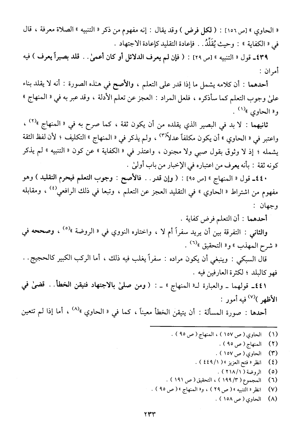 440 - قول " المنهاج " [ص 95]: (وإن قدر .. فالأصح: وجوب النعلم فيحرم التقليد) وهو مفهوم من اشتراط " الحاوي " في التقليد العجز عن التعلم، وتبعا في ذلك الرافعي (¬4)، ومقابله وجهان: