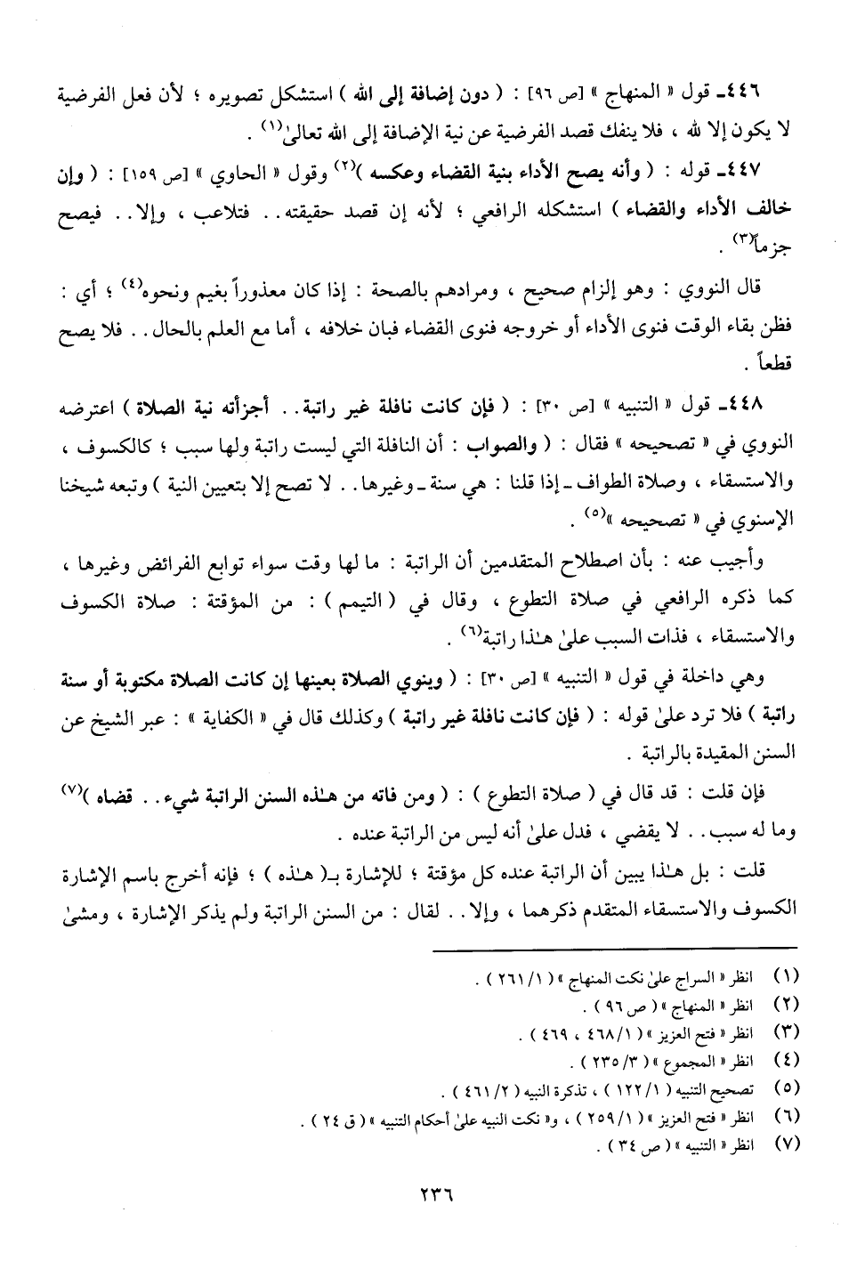 446 - قول " المنهاج " [ص 96]: (دون إضافة إلى الله) استشكل تصويره؛ لأن فعل الفرضية لا يكون إلا لله، فلا ينفك قصد الفرضية عن نية الإضافة إلى الله تعالى (¬1).