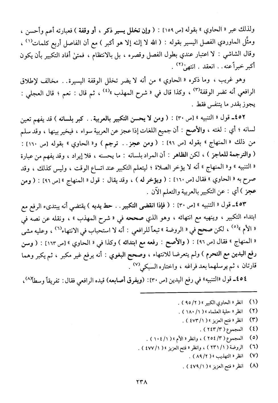 453 - قول " التنبيه " [ص 30]: (فإذا انقضى التكبير .. حط يديه) يقتضي أنه يبتدئ الرفع مع ابتداء التكبير، وينهيه مع انتهائه، وهو الذي صححه في " شرح المهذب "، ونقله عن نصه في " الأم " (¬5)، لكن صحح في " الروضة " تبعاً للرافعي: أنه لا استحباب في الانتهاء (¬6)، وعليه مشى " المنهاج " فقال [ص 96]: (والأصح: رفعه مع ابتدائه) وكذا في " الحاوي " [ص 163]: (وسن رفع اليدين مع التحرم) ولم يتعرضا للانتهاء، وصحح البغوي: أنه يرفع غير مكبر، ثم يكبر وهما قارتان، ثم يرسلهما بعد فراغه، واختاره السبكي (¬7).
