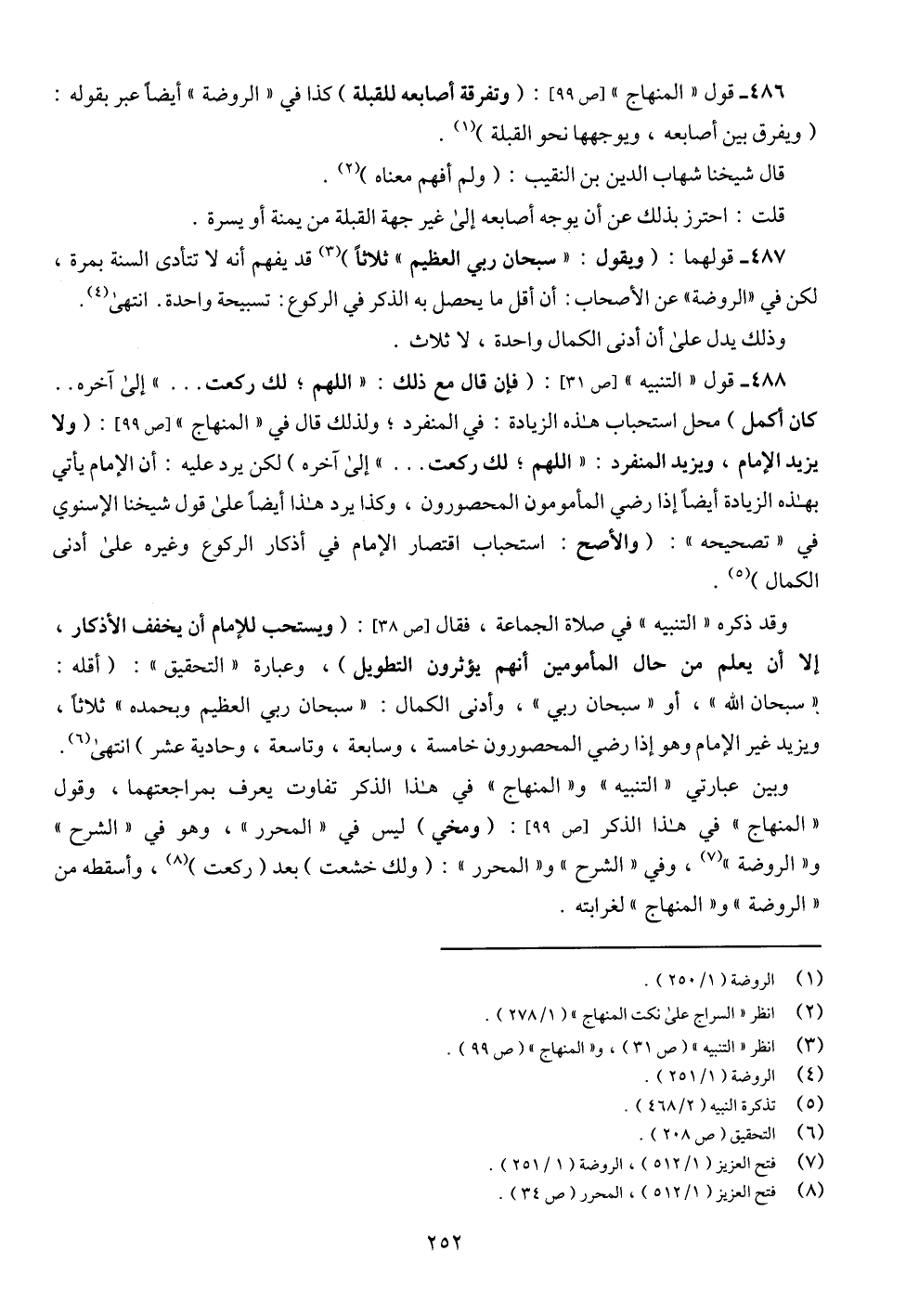 488 - قول " التنبيه " [ص 31]: (فإن قال مع ذلك: " اللهم؛ لك ركعت ... " إلى آخره .. كان أكمل) محل استحباب هذه الزيادة: في المنفرد؛ ولذلك قال في " المنهاج " [ص 99]: (ولا يزيد الإمام، ويزيد المنفرد: " اللهم؛ لك ركعت ... " إلى آخره) لكن يرد عليه: أن الإمام يأتي بهذه الزيادة أيضاً إذا رضي المأمومون المحصورون، وكذا يرد هذا أيضاً على قول شيخنا الإسنوي في " تصحيحه ": (والأصح: استحباب اقتصار الإمام في أذكار الركوع وغيره على أدنى الكمال) (¬5).