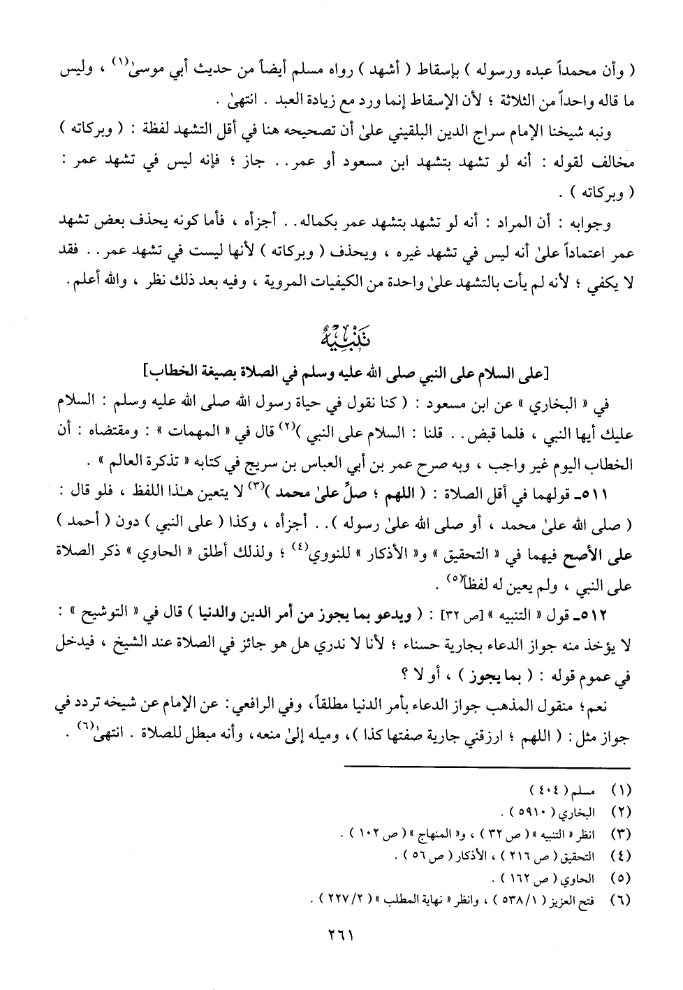 ونبه شيخنا الإمام سراج الدين البلقيني على أن تصحيحه هنا في أقل التشهد لفظة: (وبركاته) مخالف لقوله: أنه لو تشهد بتشهد ابن مسعود أو عمر .. جاز؛ فإنه ليس في تشهد عمر: (وبركاته).