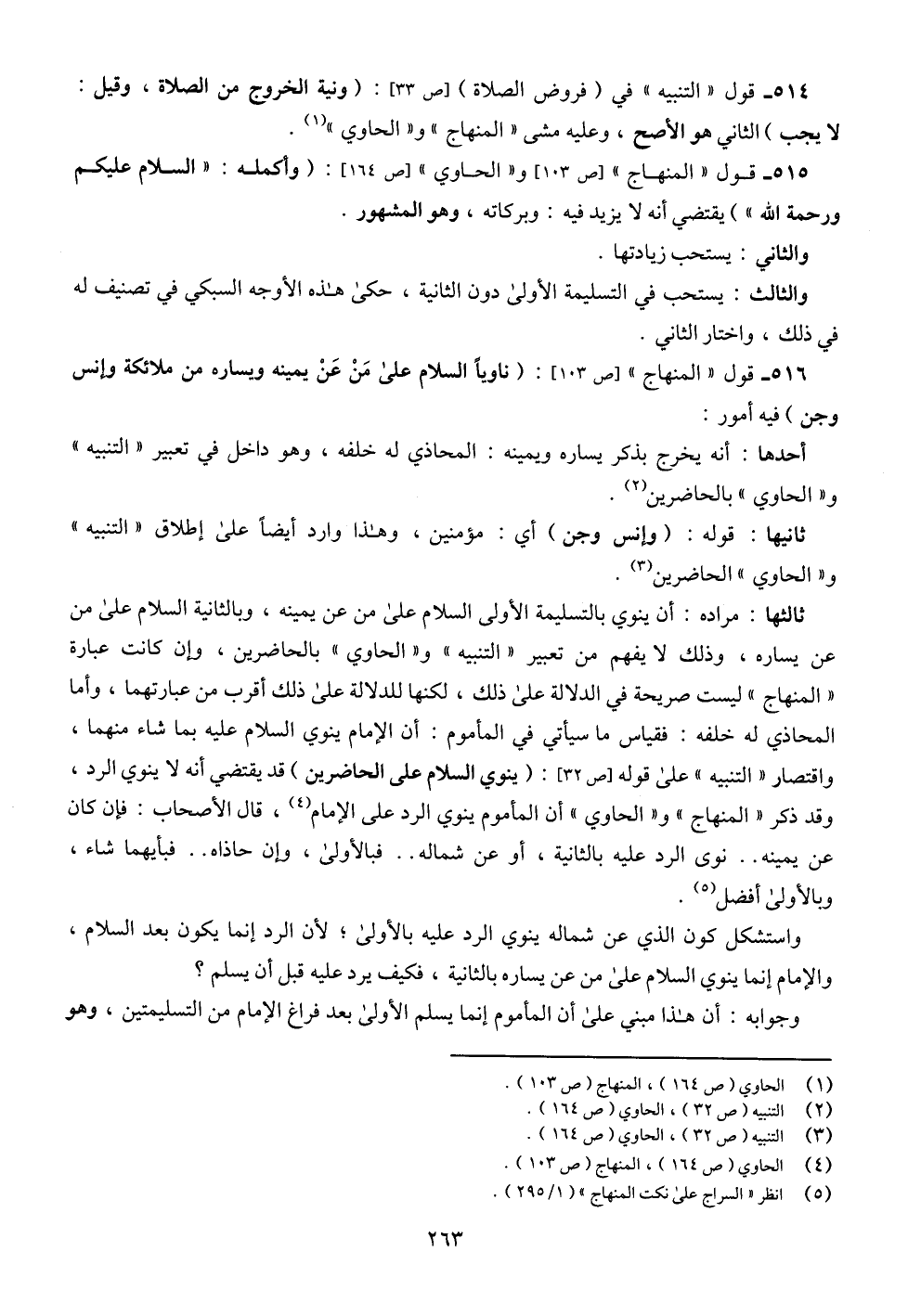 516 - قول " المنهاج " [ص 103]: (ناوياً السلام على مَنْ عَنْ يمينه ويساره من ملائكة وإنس وجن) فيه أمور: