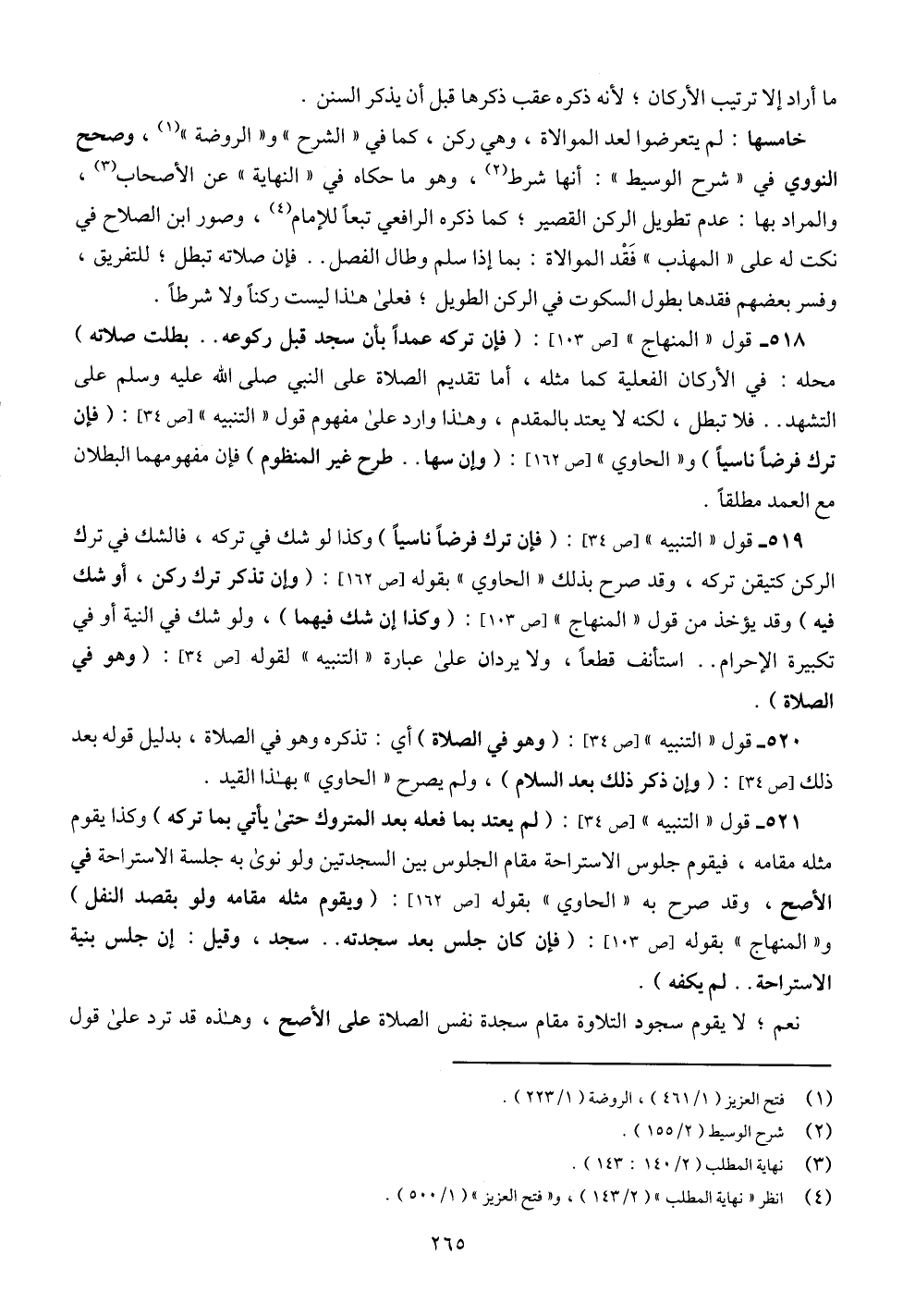 518 - قول " المنهاج " [ص 103]: (فإن تركه عمداً بأن سجد قبل ركوعه .. بطلت صلاته) محله: في الأركان الفعلية كما مثله، أما تقديم الصلاة على النبي صلى الله عليه وسلم على التشهد .. فلا تبطل، لكنه لا يعتد بالمقدم، وهذا وارد على مفهوم قول " التنبيه " [ص 34]: (فإن ترك فرضاً ناسياً) و" الحاوي " [ص 162]: (وإن سها .. طرح غير المنظوم) فإن مفهومهما البطلان مع العمد مطلقاً.