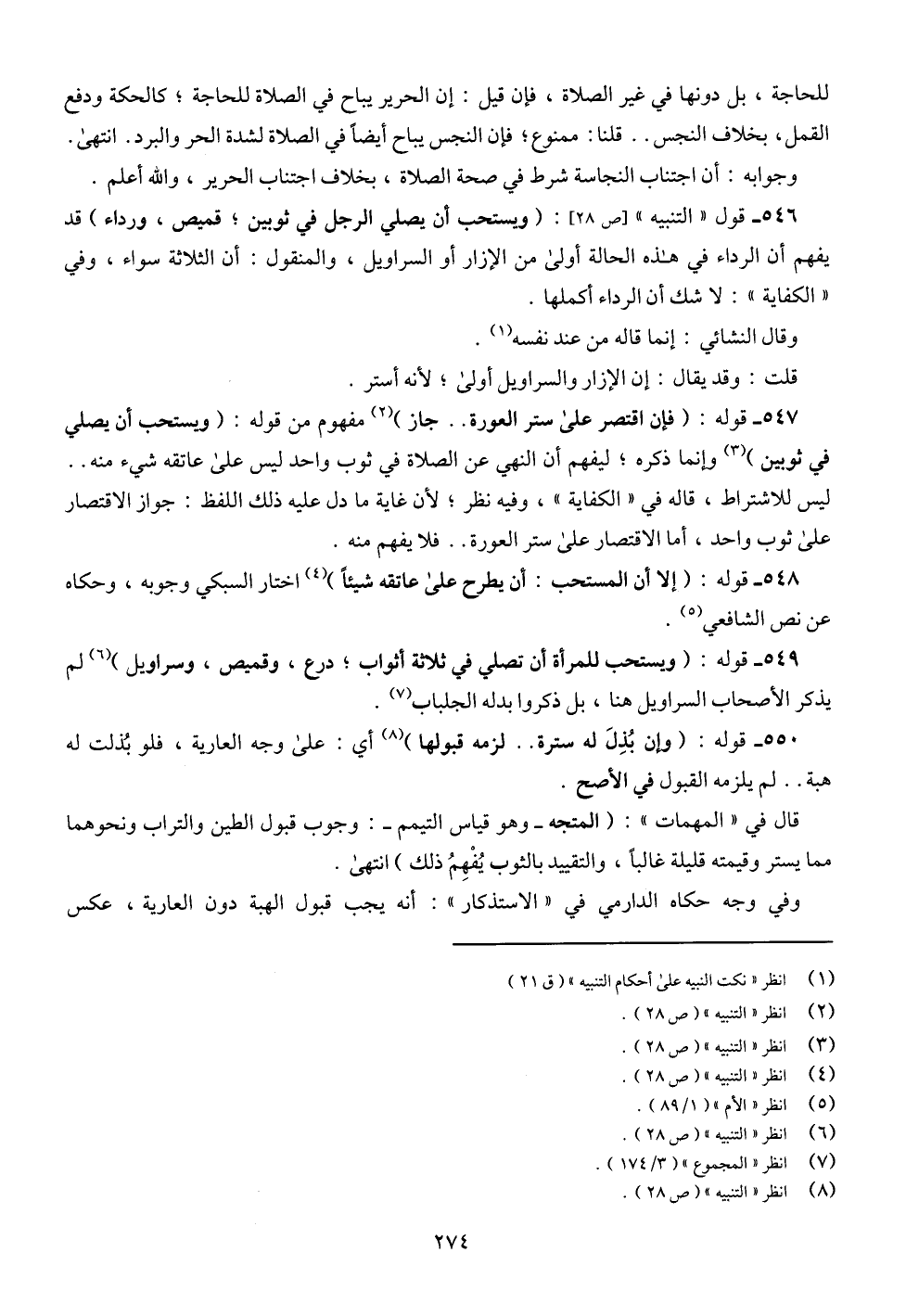 546 - قول " التنبيه " [ص 28]: (ويستحب أن يصلي الرجل في ثوبين؛ قميص، ورداء) قد يفهم أن الرداء في هذه الحالة أولى من الإزار أو السراويل، والمنقول: أن الثلاثة سواء، وفي " الكفاية ": لا شك أن الرداء أكملها.