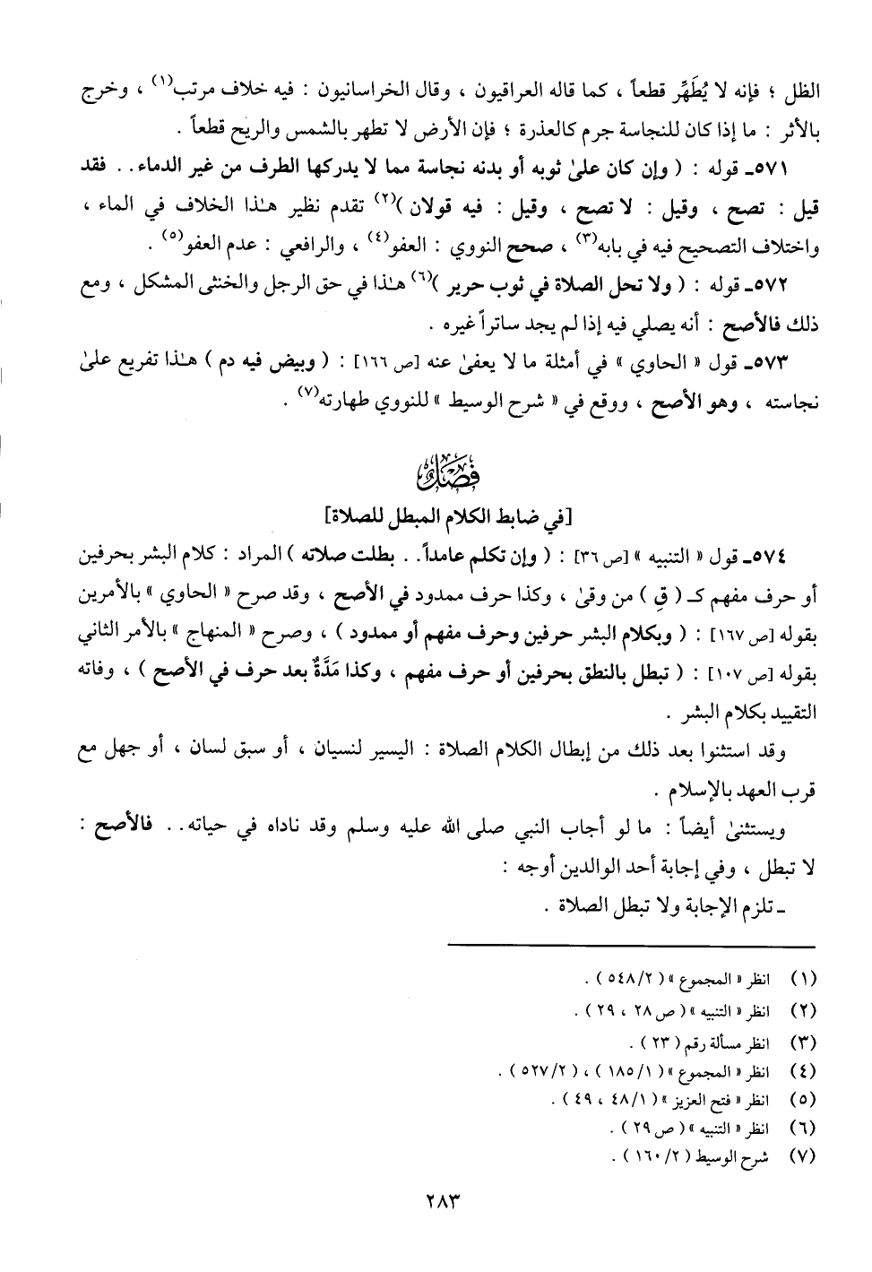574 - قول " التنبيه " [ص 36]: (وإن تكلم عامداً .. بطلت صلاته) المراد: كلام البشر بحرفين أو حرف مفهم كـ (قِ) من وقى، وكذا حرف ممدود في الأصح، وقد صرح " الحاوي " بالأمرين بقوله [ص 167]: (وبكلام البشر حرفين وحرف مفهم أو ممدود)، وصرح " المنهاج " بالأمر الثاني بقوله [ص 107]: (تبطل بالنطق بحرفين أو حرف مفهم، وكذا مَدَّةٌ بعد حرف في الأصح)، وفاته التقييد بكلام البشر.
