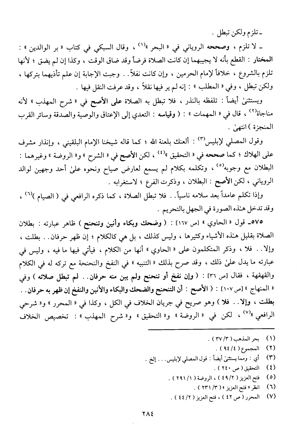 575 - قول " الحاوي " [ص 167]: (وضحك وبكاء وأنين وتنحنح) ظاهر عبارته: بطلان الصلاة بقليل هذه الأشياء وكثيرها، وليس كذلك، بل هي كالكلام؛ إن ظهر حرفان .. بطلت، وإلا .. فلا، وذكر المتكلمون على " الحاوي " أنها من الكلام، فيأتي فيها ما فيه، وليس في عبارته ما يدل على ذلك، وقد صرح بذلك " التنبيه " في النفخ والنحنحة مع تركه له في الكلام والقهقهة، فقال [ص 36]: (وإن نفخ أو تنحنح ولم يبن منه حرفان .. لم تبطل صلاته) وفي " المنهاج " [ص 107]: (الأصح: أن التنحنح والضحك والبكاء والأنين والنفخ إن ظهر به حرفان .. بطلت، وإلا .. فلا) وهو صريح في جريان الخلاف في الكل، وكذا في " المحرر " و" شرحي الرافعي " (¬7)، لكن في " الروضة " و" التحقيق " و" شرح المهذب ": تخصيص الخلاف