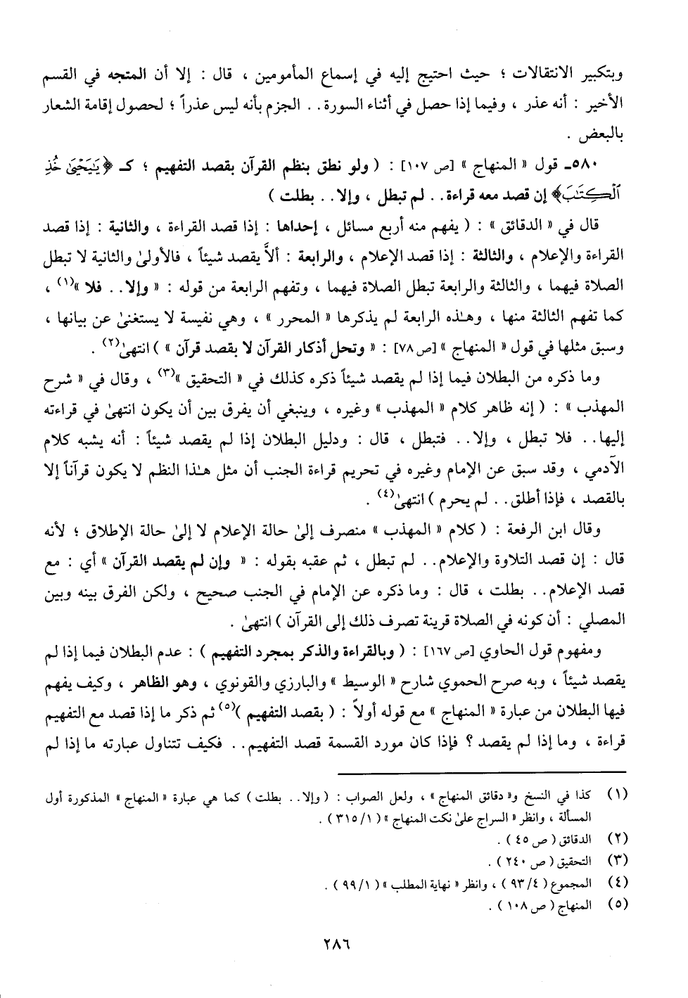 580 - قول " المنهاج " [ص 107]: (ولو نطق بنظم القرآن بقصد التفهيم؛ كـ {يَايَحْيَى خُذِ الْكِتَابَ} إن قصد معه قراءة .. لم تبطل، وإلا .. بطلت)