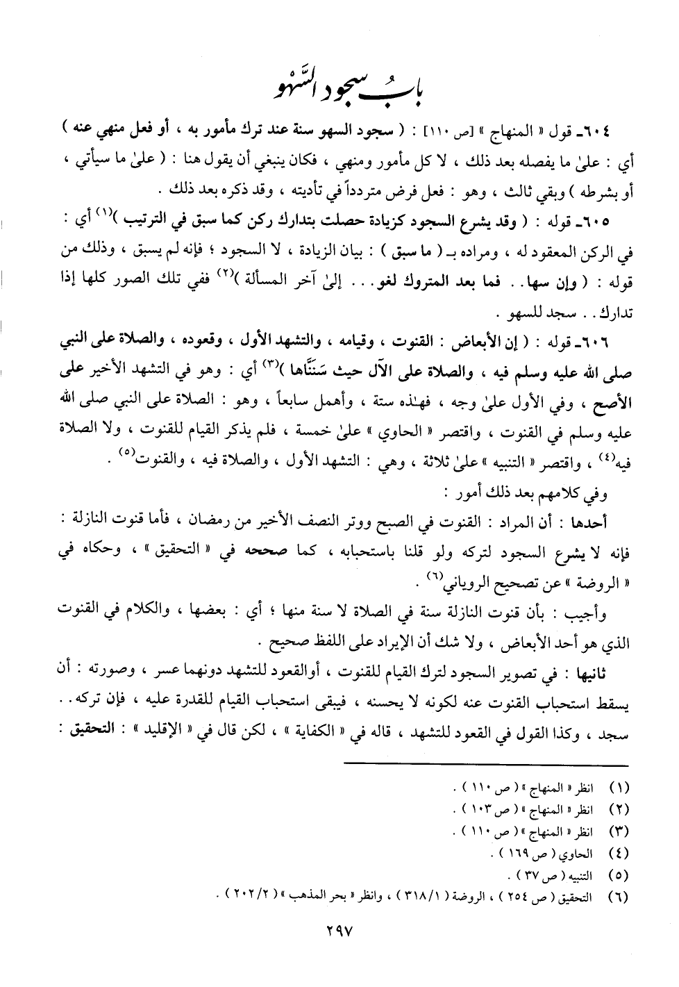 604 - قول " المنهاج " [ص 110]: (سجود السهو سنة عند ترك مأمور به، أو فعل منهي عنه) أي: على ما يفصله بعد ذلك، لا كل مأمور ومنهي، فكان ينبغي أن يقول هنا: (على ما سيأتي، أو بشرطه) وبقي ثالث، وهو: فعل فرض متردداً في تأديته، وقد ذكره بعد ذلك.