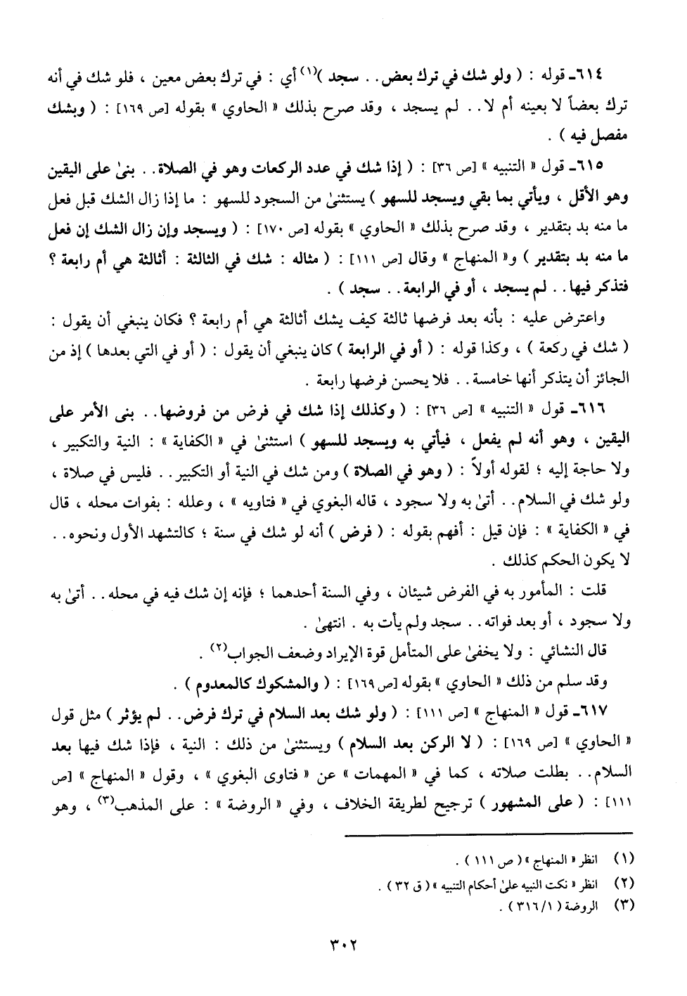 615 - قول "التنبيه" [ص 36]: (إذا شك في عدد الركعات وهو في الصلاة .. بنى على اليقين وهو الأقل، ويأتي بما بقي ويسجد للسهو) يستثنى من السجود للسهو: ما إذا زال الشك قبل فعل ما منه بد بتقدير، وقد صرح بذلك "الحاوي" بقوله [ص 170]: (ويسجد وإن زال الشك إن فعل ما منه بد بتقدير) و"المنهاج" وقال [ص 111]: (مثاله: شك في الثالثة: أثالثة هي أم رابعة؟ فتذكر فيها .. لم يسجد، أو في الرابعة .. سجد).