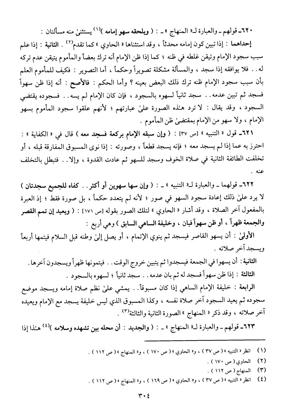 620 - قولهم -والعبارة لـ"المنهاج"-: (ويلحقه سهو إمامه) (¬1) يستثنى منه مسألتان: إحدالما: إذا تبين كون إمامه محدثًا، وقد استثناها "الحاوي" كما تقدم (¬2). الثانية: إذا علم سبب سجود الإمام وتيقن غلطه في ظنه؛ كما إذا ظن الإمام أنَّه ترك بعضًا والمأموم يتيقن عدم تركه له .. فلا يوافقه إذا سجد، والمسألة مشكلة تصويرًا وحكمًا، أما التصوير: فكيف للمأموم العلم بأن سبب سجود الإمام ظنه ترك ذلك البعض بعينه؟ وأما الحكم: فالأصح: أنَّه إذا ظن سهوًا فسجد ثم تبين عدمه .. سجد ثانيًا لسهوه بالسجود، فإن كان الإمام لم يسه .. فسجوده يقتضي السجود، وقد يقال: لا ترد هذه الصورة على عبارتهم؛ لأنهم علقوا سجود المأموم بسهو الإمام، ولا سهو من الإمام بمقتضى ظن المأموم.