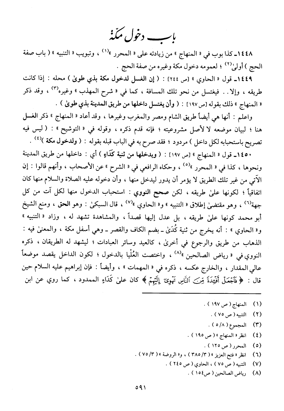 1449 - قول " الحاوي " [ص 244]: (إن الغسل لدخول مكة بذي طوى) محله: إذا كانت طريقه، وإلا .. فيغتسل من نحو تلك المسافة، كما في " شرح المهذب " وغيره (¬3)، وقد ذكر " المنهاج " ذلك بقوله [ص 197]: (وأن يغتسل داخلها من طريق المدينة بذي طوى).