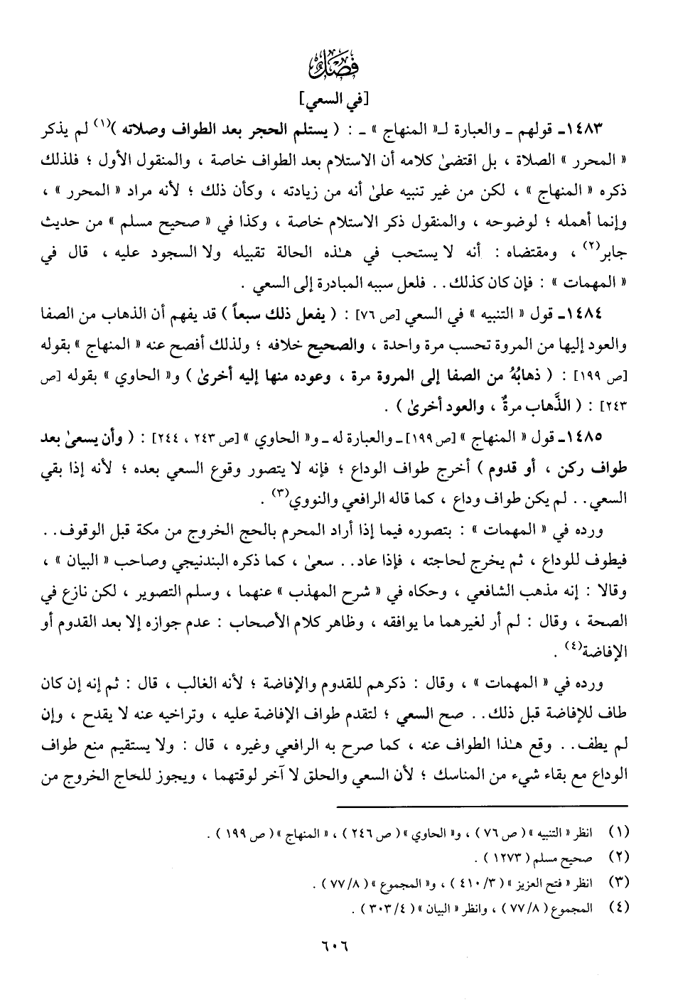 1484 - قول " التنبيه" في السعي [ص 76]: (يفعل ذلك سبعًا) قد يفهم أن الذهاب من الصفا والعود إليها من المروة تحسب مرة واحدة، والصحيح خلافه، ولذلك أفصح عنه "المنهاج" بقوله [ص 199]: (ذهابُهُ من الصفا إلى المروة مرة، وعوده منها إليه أخرى) و " الحاوي " بقوله [ص 243]: (الذَّهاب مرةٌ، والعود أخرى).