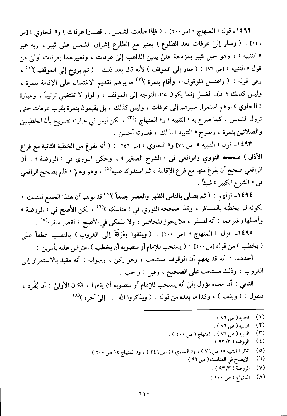1495 - قول "المنهاج" [ص 200]: (ويقفوا بعَرَفَةَ إلى الغروب) بالنصب عطفًا على (يخطب) من قوله [ص 200]: (يستحب للإمام أو منصوبه أن يخطب) اعترض عليه بأمرين: