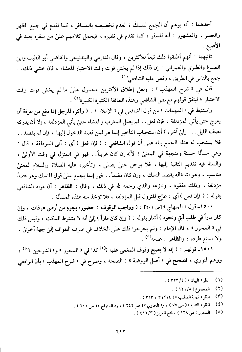 1500 - قول "المنهاج" [ص 201]: (وواجب الوقوف: حضوره بجزءٍ من أرض عرفات، وإن كان مارًا في طلب آبقٍ ونحوه) أشار بقوله: (وإن كان مارًا) إلى أنه لا يشترط المكث، وليس ذلك في "المحرر"، قال الإمام: ولم يخرجوا ذلك على الخلاف في صرف الطواف إلى جهة أخرى، ولا يمتنع طرده، والظاهر: عدمه (¬3).