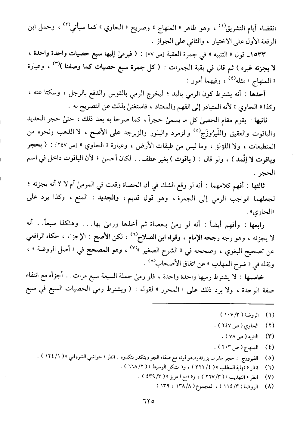 1533 - قول "التنبيه" في جمرة العقبة [ص 77]: (فيرمى إليها سبع حصيات واحدة واحدة، لا يجزئه غيره) ثم قال في بقية الجمرات: (كل جمرة سبع حصيات كما وصفنا) (¬3)، وعبارة "المنهاج" مثله (¬4)، وفيهما أمور: