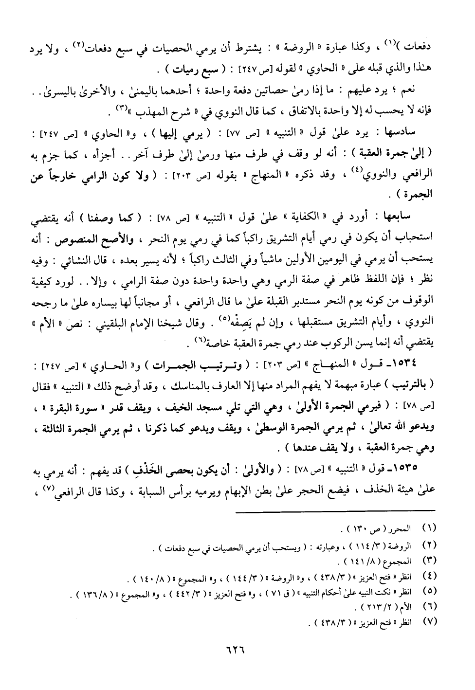 1535 - قول "التنبيه" [ص 78]: (والأولى: أن يكون بحصى الخَذْفِ) قد يفهم: أنه يرمي به على هيئة الخذف، فيضع الحجر على بطن الإبهام ويرميه برأس السبابة، وكذا قال الرافعي (¬7)،