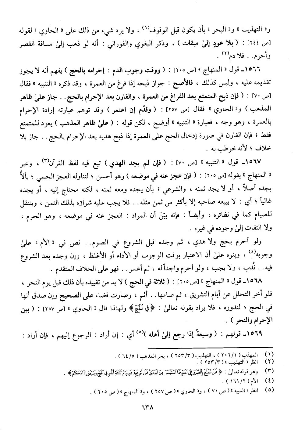 1566 - قول "المنهاج" [ص 205]: (ووقت وجوب الدم: إحرامه بالحج) يفهم أنه لا يجوز تقديمه عليه، وليس كذلك، فالأصح: جواز ذبحه إذا فرغ من العمرة، وقد ذكره "التنبيه" فقال [ص 70]: (فإن ذبح المتمتع بعد الفراغ من العمرة، والقارن بعد الإحرام بالحج .. جاز على ظاهر المذهب) و"الحاوي" فقال [ص 257]: (وقدّم إن اعتمر) وقد توهم عبارته إرادة الإحرام بالعمرة، وهو وجه، فعبارة "التنبيه" أوضح، لكن قوله: (على ظاهر المذهب) يعود للمتمتع فقط؛ فإن القارن في صورة إدخال الحج على العمرة إذا ذبح هديه بعد الإحرام بالحج .. جاز بلا خلاف؛ لأنه خوطب به.