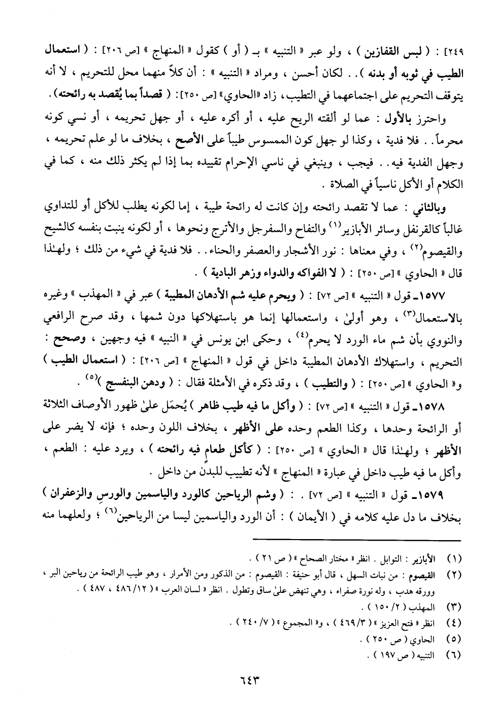 1578 - قول "التنبيه" [ص 72]: (وأكل ما فيه طيب ظاهر) يُحمَل على ظهور الأوصاف الثلاثة أو الرائحة وحدها، وكذا الطعم وحده على الأظهر، بخلاف اللون وحده؛ فإنه لا يضر على الأظهر؛ ولهذا قال "الحاوي" [ص 250]: (كأكل طعامٍ فيه رائحته)، ويرد عليه: الطعم، وأكل ما فيه طيب داخل في عبارة "المنهاج" لأنه تطييب للبدن من داخل.