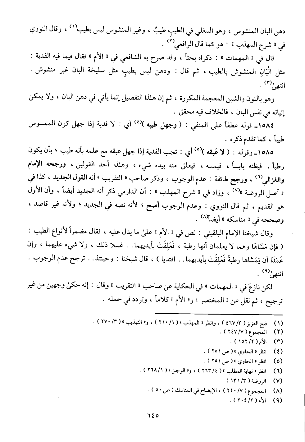 وقال شيخنا الإمام البلقيني: نص في "الأم" على ما يدل عليه، فقال مضمرًا لأنواع الطيب: (فإن مَسَّاهَا وهما لا يعلمان أنها رطبة، فَعَلِقَتْ بأيديهما .. غسلا ذلك، ولا شيء عليهما، وإن عَمَدَا أن يَمَسَّاها رطبةً فَعَلِقَتْ بأيديهما .. افتديا)، قال شيخنا: وحينئذ .. ترجح عدم الوجوب. انتهى (¬9).