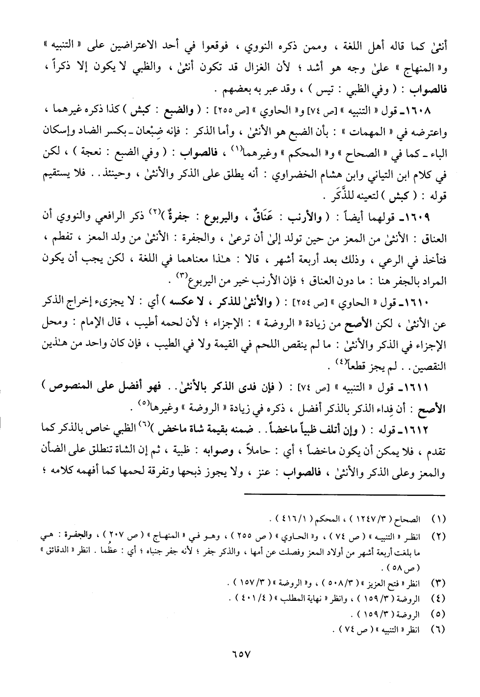 1609 - قولهما أيضًا: (والأرنب: عَنَاقٌ، واليربوع: جفرةٌ) (¬2) ذكر الرافعي والنووي أن العناق: الأنثى من المعز من حين تولد إلى أن ترعى، والجفرة: الأنثى من ولد المعز، تفطم، فتأخذ في الرعي، وذلك بعد أربعة أشهر، قالا: هذا معناهما في اللغة، لكن يجب أن يكون المراد بالجفر هنا: ما دون العناق؛ فإن الأرنب خير من اليربوع (¬3).