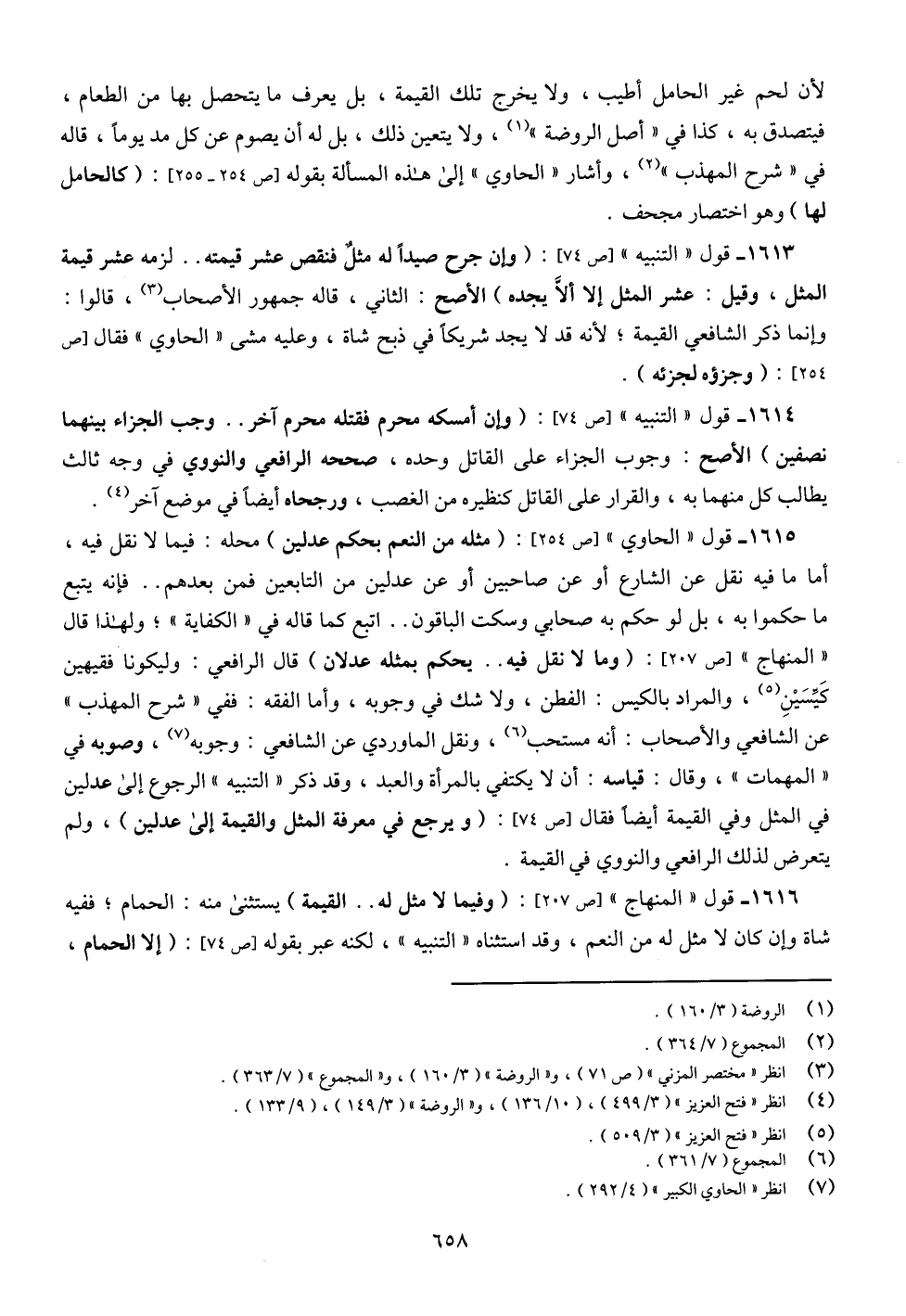 1616 - قول "المنهاج" [ص 207]: (وفيما لا مثل له .. القيمة) يستثنى منه: الحمام؛ ففيه شاة وإن كان لا مثل له من النعم، وقد استثناه "التنبيه"، لكنه عبر بقوله [ص 74]: (إلَّا الحمام،