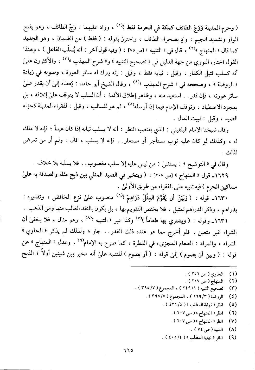 1629 - قول "المنهاج" [ص 207]: (ويتخير في الصيد المثلي بين ذبح مثله والصدقة به على مساكين الحرم) فيه تنبيه على الفقراء من طريق الأولى.