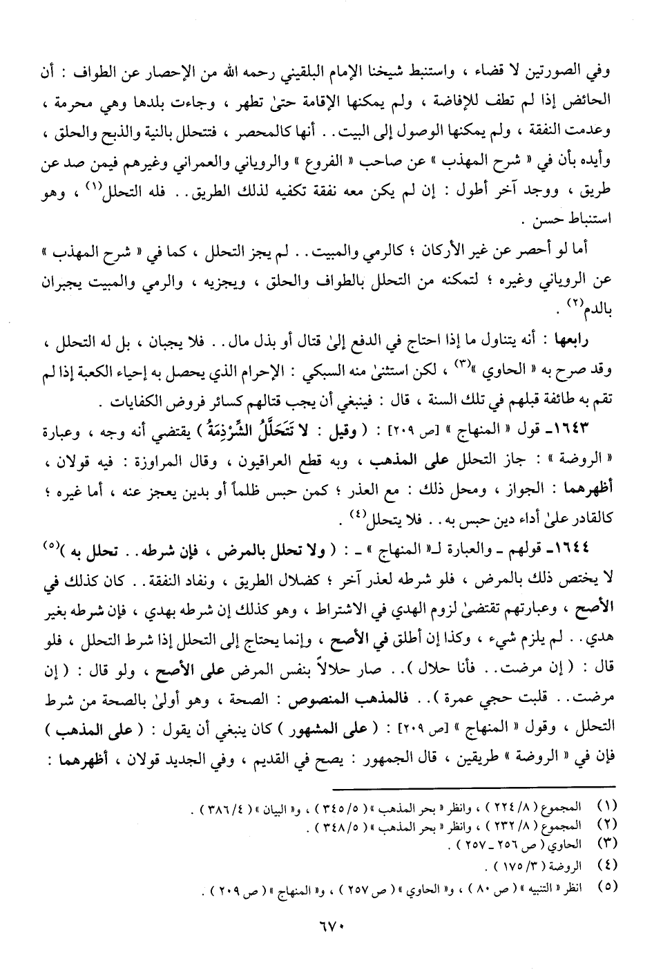 1643 - قول "المنهاج" [ص 209]: (وقيل: لا تَتَحَلَّلُ الشِّرْذِمَةُ) يقتضي أنَّه وجه، وعبارة "الروضة": جاز التحلل على المذهب، وبه قطع العراقيون، وقال المراوزة: فيه قولان، أظهرهما: الجواز، ومحل ذلك: مع العذر؛ كمن حبس ظلما أو بدين يعجز عنه، أما غيره؛ كالقادر على أداء دين حبس به .. فلا يتحلل (¬4).
