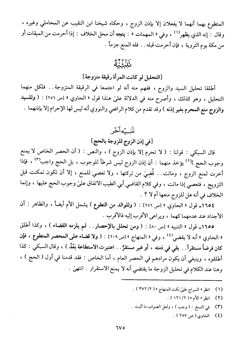 أطلقا تحليل السيد والزوج، ففهم منه أنَّه لو اجتمعا في الرفيقة المتزوجة .. فلكل منهما التحليل، وهو كذلك، وأصرح منه في الدلالة على هذا قول "الحاوي" [ص 256]: (وللسيد والزوج منع المحرم بغير إذنه) وقد تقدم من كلام الرافعي والنووي أنَّه ليس لها الإحرام إلَّا بإذنهما.