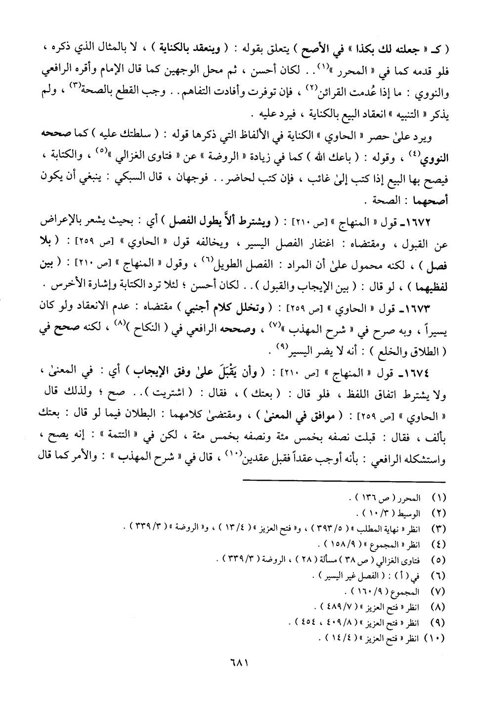 1672 - قول "المنهاج" [ص 210]: (ويشترط ألَّا يطول الفصل) أي: بحيث يشعر بالإعراض عن القبول، ومقتضاه: اغتفار الفصل اليسير، ويخالفه قول "الحاوي" [ص 259]: (بلا فصل)، لكنه محمول على أن المراد: الفصل الطويل (¬6)، وقول "المنهاج" [ص 210]: (بين لفظيهما)، لو قال: (بين الإيجاب والقبول) .. لكان أحسن؛ لئلا ترد الكتابة وإشارة الأخرس.