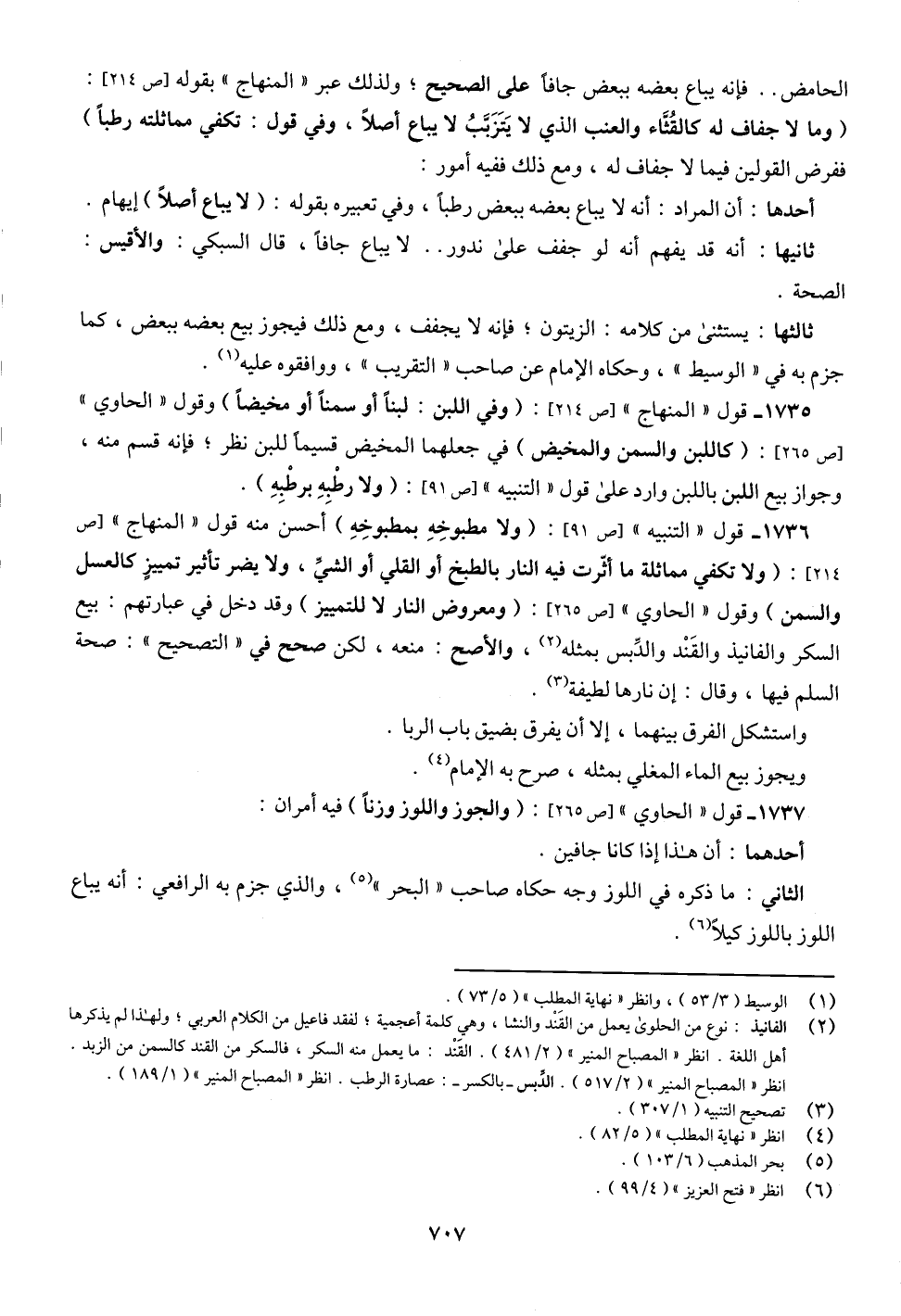 1736 - قول "التنبيه" [ص 91]: (ولا مطبوخِهِ بمطبوخِهِ) أَحسن منه قول "المنهاج" [ص 214]: (ولا تكفي مماثلة ما أثّرت فيه النار بالطبخ أو القلي أو الشي، ولا يضر تأثير تمييزٍ كالعسل والسمن) وقول "الحاوي" [ص 265]: (ومعروض النار لا للتمييز) وقد دخل في عبارتهم: بيع السكر والفانيذ والقَنْد والدِّبس بمثله (¬2)، والأصح: منعه، لكن صحح في "التصحيح": صحة السلم فيها، وقال: إن نارها لطيفة (¬3).
