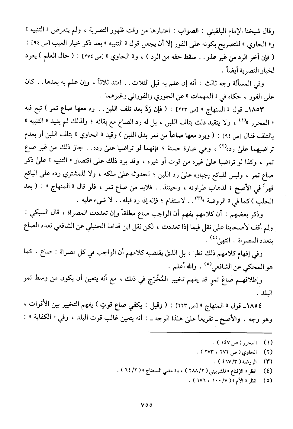 1853 - قول "المنهاج" [ص 223]: (فإن رَدَّ بعد تلف اللبن .. رد معها صاع تمر) تبع فيه "المحرر" (¬1)، ولا يتقيد ذلك بتلف اللبن، بل له رد الصاع مع بقائه؛ ولذلك لم يقيد "التنبيه" بالتلف فقال [ص 94]: (ويرد معها صاعًا من تمر بدل اللبن) وقيد "الحاوي" بتلف اللبن أو بعدم تراضيهما على رده (¬2)، وهي عبارة حسنة؛ فإنهما لو تراضيا على رده .. جاز ذلك من غير صاع تمر، وكذا لو تراضيا على غيره من قوت أو غيره، وقد يرد ذلك على اقتصار "التنبيه" على ذكر صاع تمر، وليس للبائع إجباره على رد اللبن؛ لحدوثه على ملكه، ولا للمشتري رده على البائع قهرًا في الأصح؛ لذهاب طراوته، وحينئذ .. فلابد من صاع تمر، فلو قال "المنهاج": (بعد الحلب) كما في "الروضة" (¬3) .. لاستقام؛ فإنه إذا رد قبله .. لا شيء عليه.