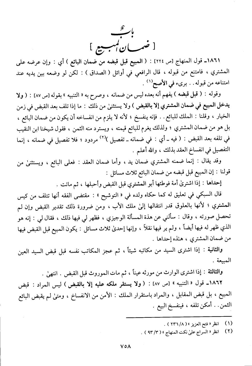 1861 - قول المنهاج [ص 224]: (المبيع قبل قبضه من ضمان البائع) أي: وإن عرضه على المشتري، فامتنع من قبوله، قال الرافعي في أوائل (الصداق): لكن لو وضعه بين يديه عند امتناعه من قبوله .. برئ في الأصح (¬1).
