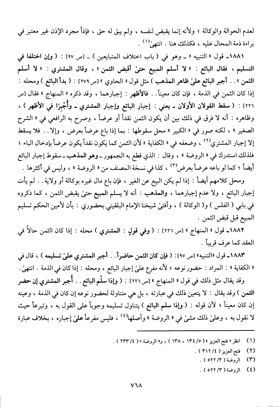 1883 - قول "التنبيه" [ص 97]: (فإن كان الثمن حاضرًا .. أجبر المشتري على تسليمه)، قال في "الكفاية": المراد: حضور نوعه؛ لأنه مفرع على إجبار البائع، ومحله: إذا كان في الذمة. انتهى.