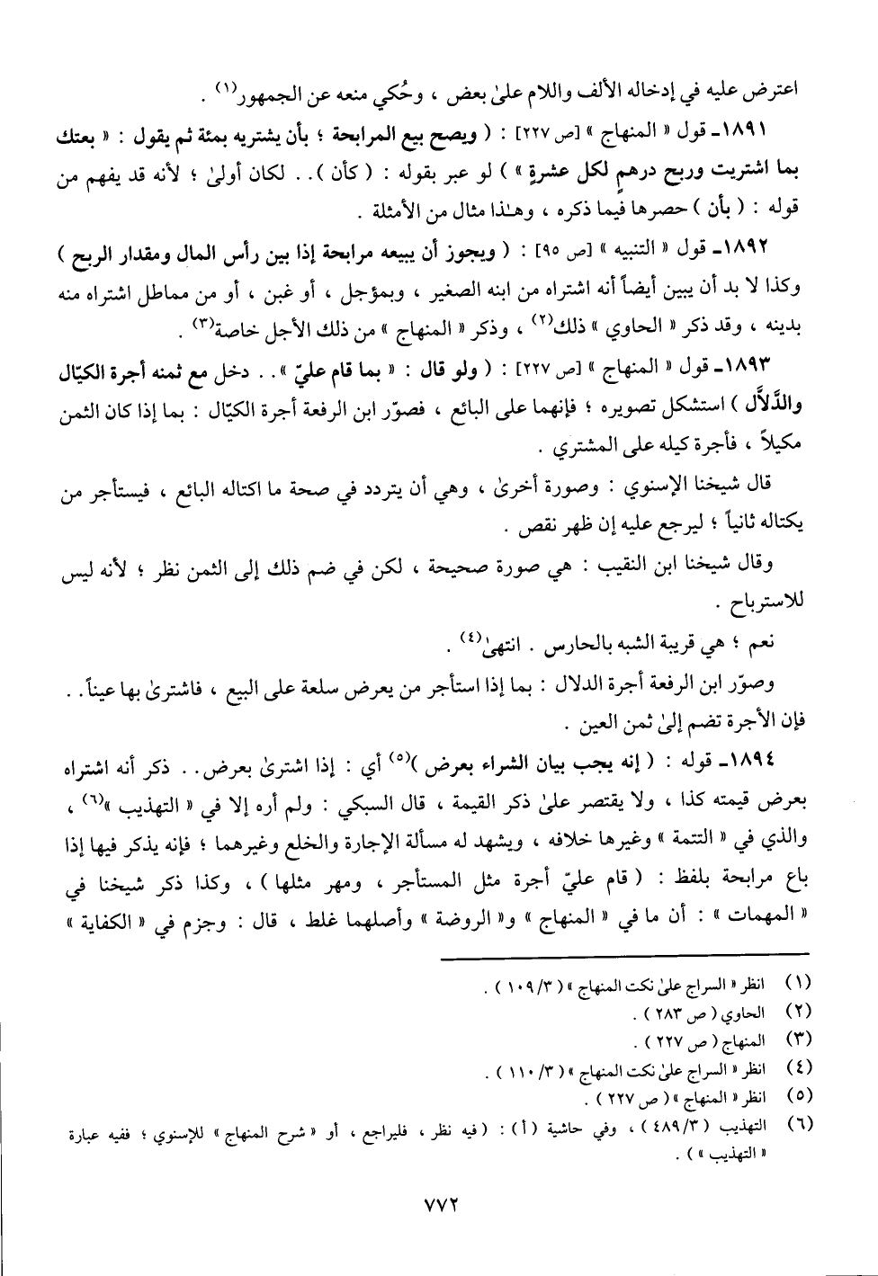 1891 - قول "المنهاج" [ص 227]: (ويصح بيع المرابحة؛ بأن يشتريه بمئة ثم يقول: "بعتك بما اشتريت وربح درهمٍ لكل عشرةٍ") لو عبر بقوله: (كأن) .. لكان أولى؛ لأنه قد يفهم من قوله: (بأن) حصرها فيما ذكره، وهذا مثال من الأمثلة.