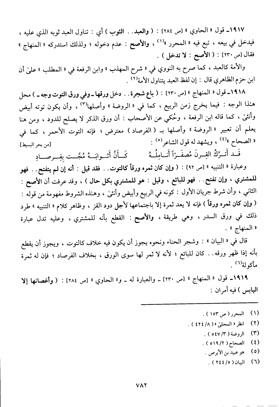 1918 - قول "المنهاج" [ص 230]: (باع شجرة .. دخل ورقها - وفي ورق التوت وجه -) محل هذا الوجه: فيما يخرج زمن الربيع، كما في "الروضة" وأصلها (¬3)، وأن يكون توته أبيض وأنثى، كما قاله ابن الرفعة، وحُكي عن الأصحاب: أن ورف الذكر لا يصلح للدود، ومن هنا يعلم أن تعبير "الروضة" وأصلها بـ (الفرصاد) معترض؛ فإنه التوت الأحمر، كما في "الصحاح" (¬4)، ويشهد له قول الشاعر (¬5): [من بحر البسيط]