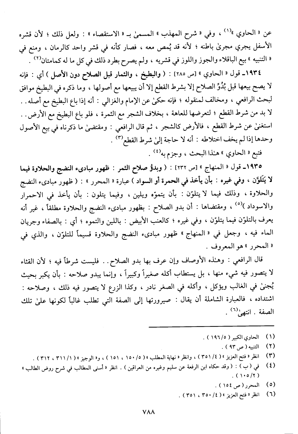 1935 - قول "المنهاج" [ص 232]: (وبدوُّ صلاح الثمر: ظهور مبادئ النضج والحلاوة فيما لا يَتَلوَّن، وفي غيره: بأن يأخذ في الحمرة أو السواد) عبارة "المحرر": (ظهور مبادئ النضج والحلاوة، وذلك فيما لا يتلوّن: بأن يتموّه ويلين، وفيما يتلون: بأن يأخذ في الاحمرار والاسوداد) (¬5)، ومقتضاها: أن بدو الصلاح: بظهور مبادئ النضج والحلاوة مطلقًا، غير أنه يعرف بالتلوّن فيما يتلوّن، وفي غيره؛ كالعنب الأبيض: باللين والتموه؛ أي: بالصفاء وجريان الماء فيه، وجعل في "المنهاج" ظهور مبادئ النضج والحلاوة قسيمًا للتلوّن، والذي في "المحرر" هو المعروف.
