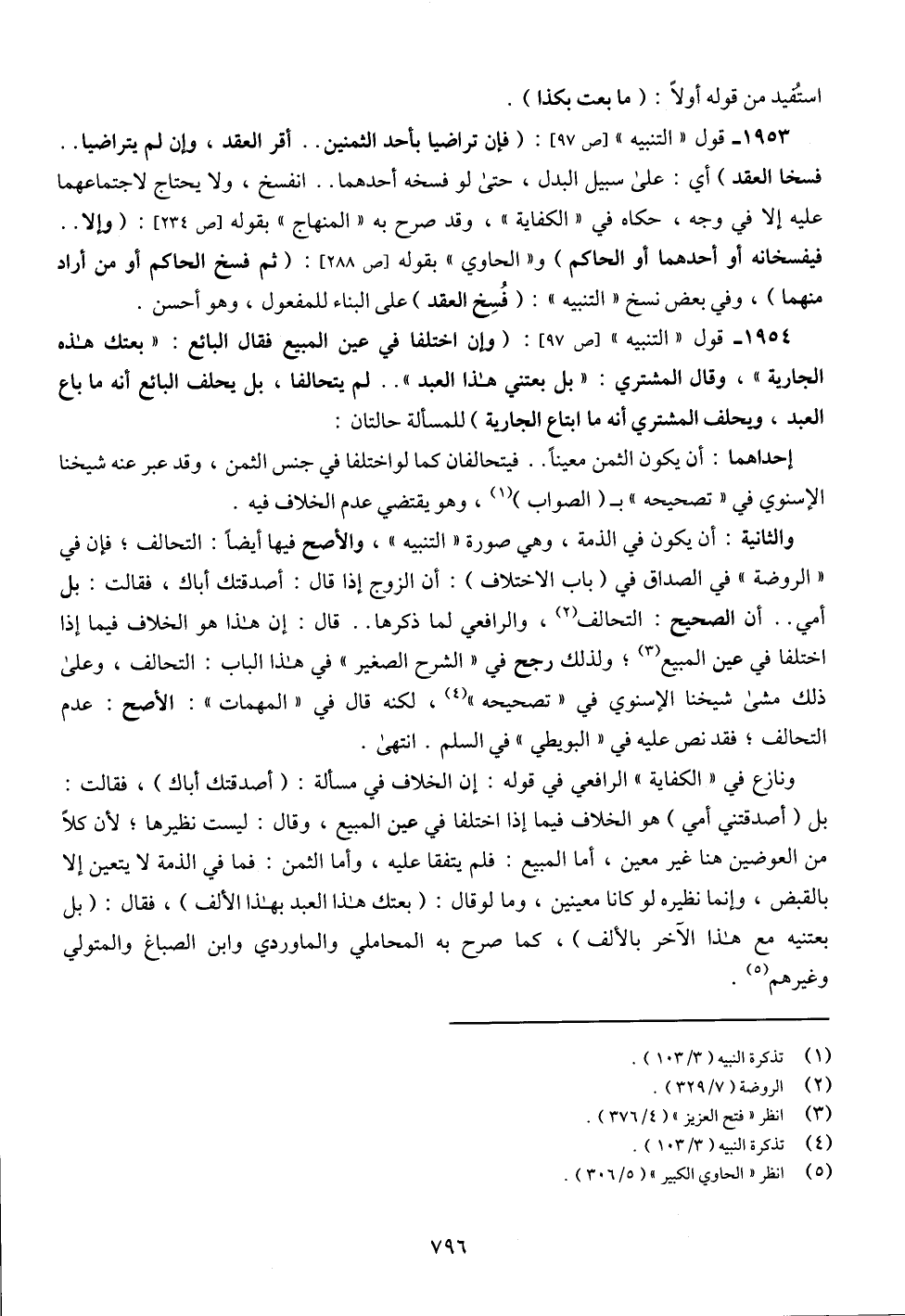 1953 - قول "التنبيه" [ص 97]: (فإن تراضيا بأحد الثمنين .. أقر العقد، وإن لم يتراضيا .. فسخا العقد) أي: على سبيل البدل، حتى لو فسخه أحدهما .. انفسخ، ولا يحتاج لاجتماعهما عليه إلا في وجه، حكاه في "الكفاية"، وقد صرح به "المنهاج" بقوله [ص 234]: (وإلا .. فيفسخانه أو أحدهما أو الحاكم) و"الحاوي" بقوله [ص 288]: (ثم فسخ الحاكم أو من أراد منهما)، وفي بعض نسخ "التنبيه": (فُسِخ العقد) على البناء للمفعول، وهو أحسن.