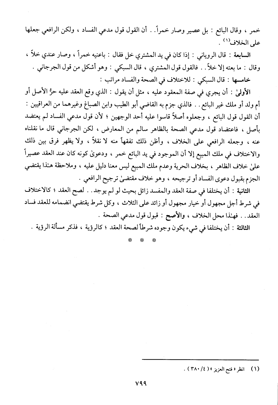 الأولى: أن يجري في صفة المعقود عليه، مثل أن يقول: الذي وقع العقد عليه حرُّ الأصل أو أم ولد أو ملك غير البائع .. فالذي جزم به القاضي أبو الطيب وابن الصباغ وغيرهما من العراقيين: أن القول قول البائع، وجعلوه أصلًا قاسوا عليه أحد الوجهين؛ لأن قول مدعي الفساد لم يعتضد بأصل، فاعتضاد قول مدعي الصحة بالظاهر سالم من المعارض، لكن الجرجاني قال ما نقلناه عنه، وجعله الرافعي على الخلاف، وأظن ذلك تفقهًا منه لا نقلًا، ولا يظهر فرق بين ذلك والاختلاف في ملك المبيع إلا أن الموجود في يد البائع خمر، ودعوى كونه كان عند العقد عصيرًا على خلاف الظاهر، بخلاف الحرية وعدم ملك المبيع ليس معنا دليل عليه، وملاحظة هذا يقتضي الجزم بقبول دعوى الفساد أو ترجيحه، وهو خلاف مقتضى ترجيح الرافعي.